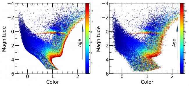 Diagrama con la distribución de estrellas donde se relaciona su luminosidad (magnitud) en función de su temperatura (color). Para un contenido en metales determinado, el diagrama color-magnitud muestra secuencias específicas donde pueden identificarse la edad de las estrellas (barra vertical, cuanto más rojas, más envejecidas). A la izquierda, diagrama color-magnitud no afectado por el emborronamiento de las observaciones donde puede determinarse la edad de las estrellas con suficiente precisión. A la derecha, el emborronamiento dificulta determinar la edad de las estrellas. Crédito: Sebastián Hidalgo (IAC).