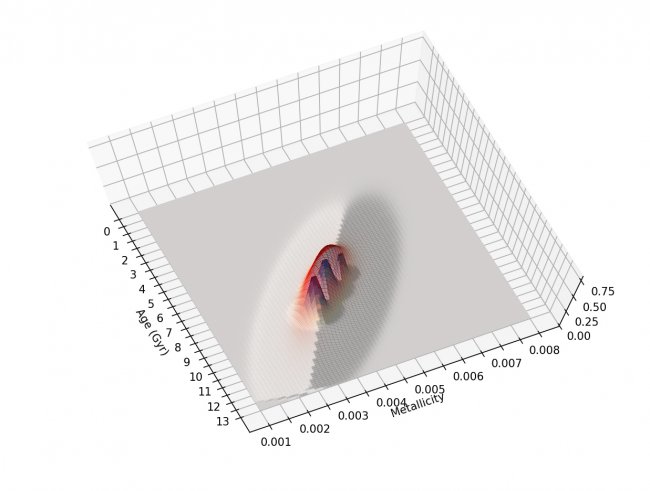 Figura que muestra en rojo la historia de formación estelar (SFH, por sus siglas en inglés) afectada por las observaciones. Si se pudieran corregir estos efectos, podría obtenerse con más detalle y distinguir tres picos (en azul) en lugar de uno. Crédito: Sebastián Hidalgo (IAC).