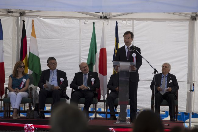 Takaaki Kajita durante su intervención en la ceremonia de inauguración del telescopio LST1. Crédito: Daniel López / IAC.