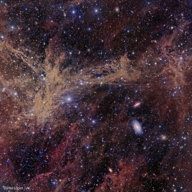 Imagen obtenida y procesada por el astrofotógrafo Daniel López con el Astrógrafo Remoto (AR), también conocido como ”Fotomatón cósmico”, de la Unidad de Comunicación y Cultura Científica (UC3), del Instituto de Astrofísica de Canarias (IAC) desde el Observatorio del Teide (Izaña, Tenerife). Se trata de una imagen de larga exposición (14 horas en el filtro L, que permite el paso de toda la luz visible), a la que se le ha dado color gracias al uso de tres filtros de banda ancha (R:rojo; G:verde; B:azul), con exposiciones totales de tres horas en cada uno de ellos, además de obtener algunos detalles nebulares a partir de otras tres horas de exposición en el filtro de banda estrecha H-alfa. La imagen muestra simultáneamente regiones muy débiles junto a otras más brillantes. El color que se muestra corresponde aproximadamente con el que veríamos con nuestros ojos si éstos fuesen extraordinariamente sensibles.