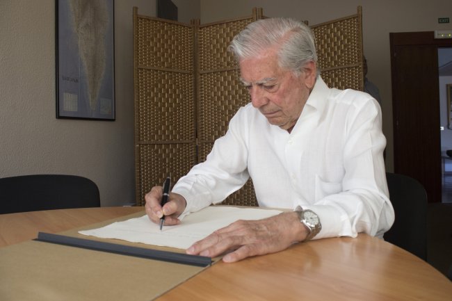 Mario Vargas Llosa, premio nobel de Literaura en 2010, escribe para el Libro de Honor del IAC. Crédito: Iván Jiménez (IAC).