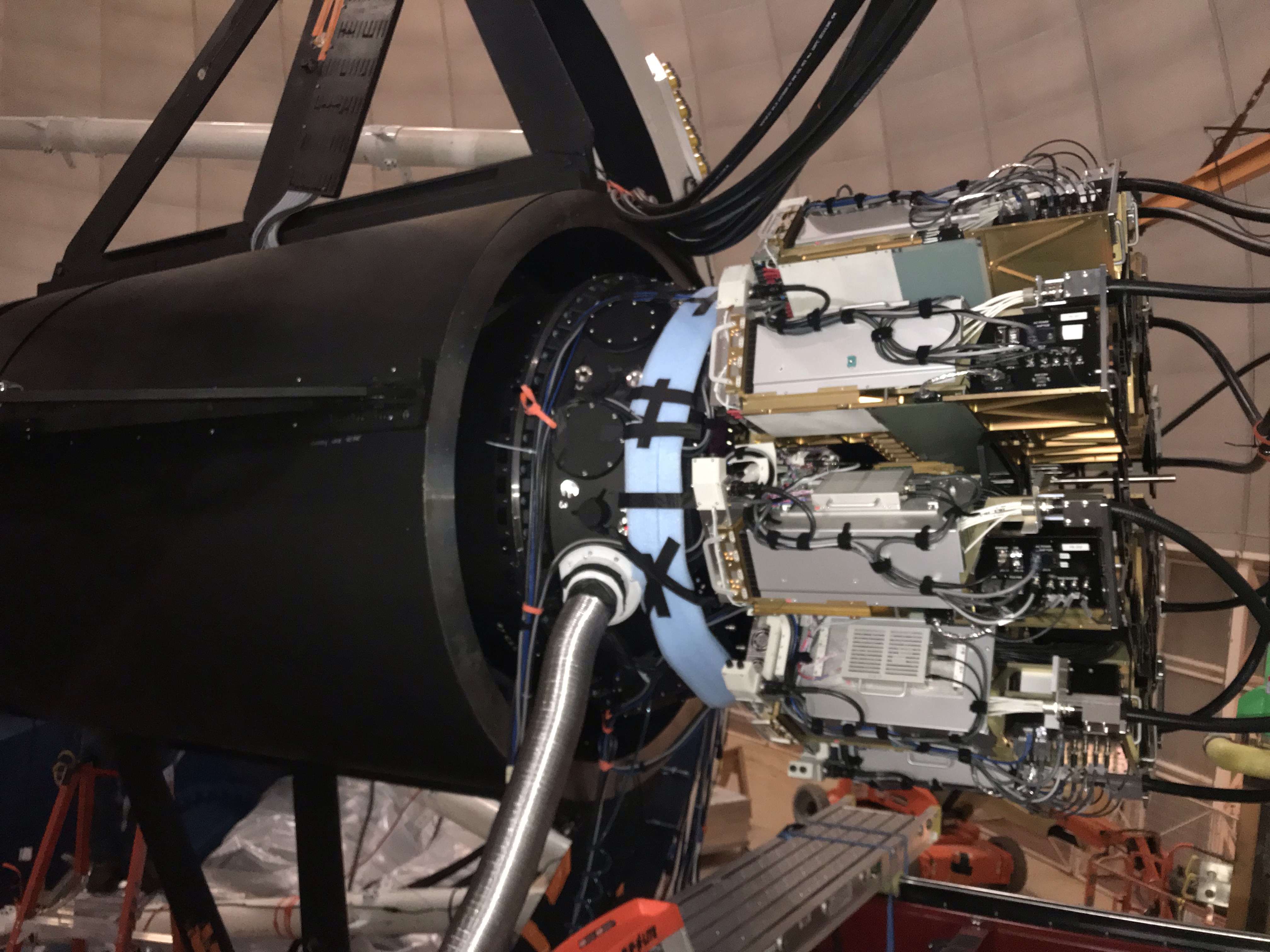 Plano focal de DESI está formado por 10 pétalos, y cada pétalo contiene 500 posicionadores robóticos que apuntan individualmente y recogen la luz a través de cables de fibra óptica. Christian Soto, Investigación en Astronomía Óptica-Infrarroja/AURA/NSF