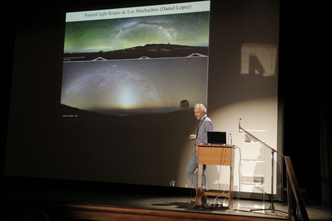 Sergio Ortolani, primer ponente del segundo bloque de la jornada mostrando imágenes del cielo de La Palma tomadas por el astrofotógrafo Daniel López. Crédito. Elena Mora (IAC).