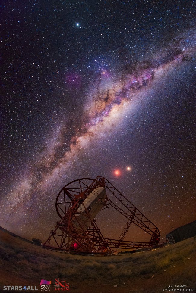 Composición de la totalidad. En la imagen se muestra el mayor Telescopio Cherenkov del mundo en posición de aparcado. La Vía Láctea austral atraviesa la imagen en diagonal y el punto más brillante de la parte superior es el Planeta Júpiter. Junto a la Luna Roja (en el centro de la imagen) brilla Marte. Crédito: J.C. Casado.