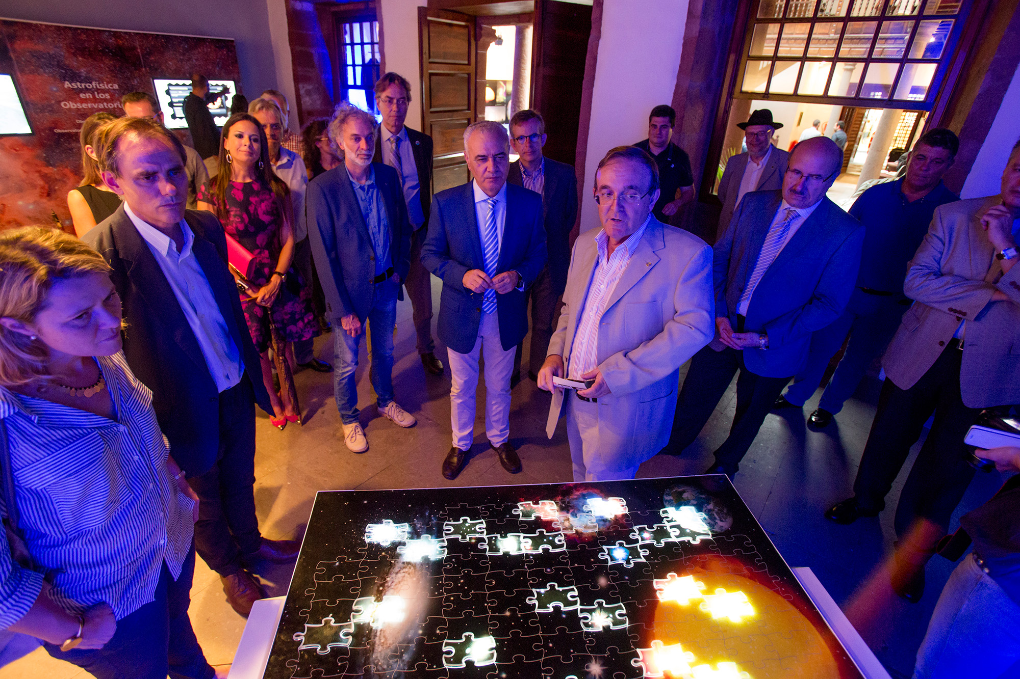 El director del IAC, Rafael Rebolo, la consejera de Turismo del Cabildo Insular de La Palma, Alicia Vanoostende, y el director insular de la Administración General del Estado en la Isla, Miguel Ángel Morcuende, con Juan Antonio Belmonte -uno de los comisarios de la exposición "Luces del Universo"-, el administrador del Observatorio del Roque de los Muchachos, Juan Carlos Pérez Arencibia, y representantes de las instituciones telescópicas de este observatorio, junto a público general en el módulo sobre "Hitos científicos del IAC". Créditos: Daniel López/IAC.