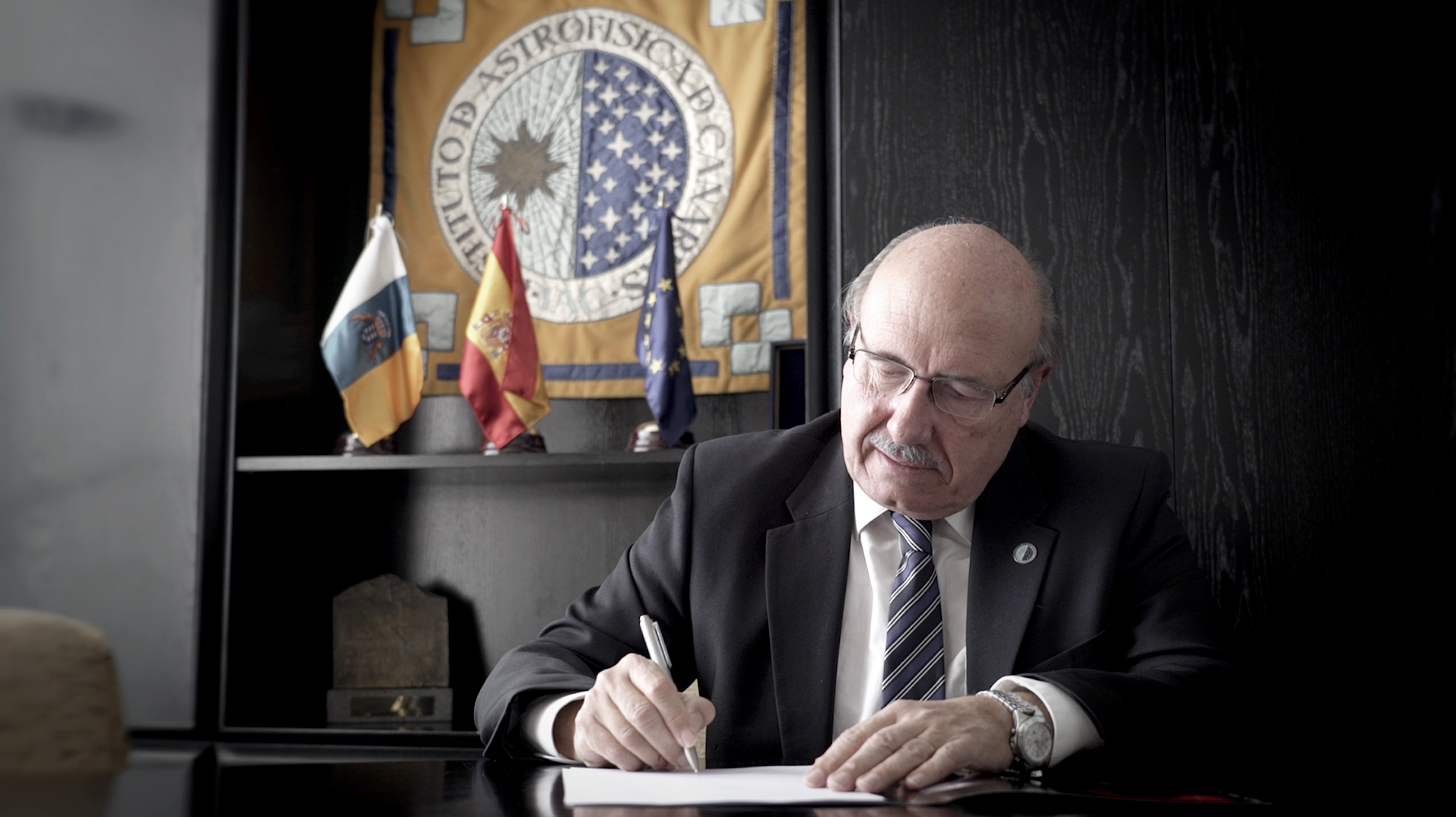 El director del IAC, Rafael Rebolo durante la firma del convenio de colaboración con AEMET, el pasado 22 de febrero de 2022. Crédito: Inés Bonet (IAC)