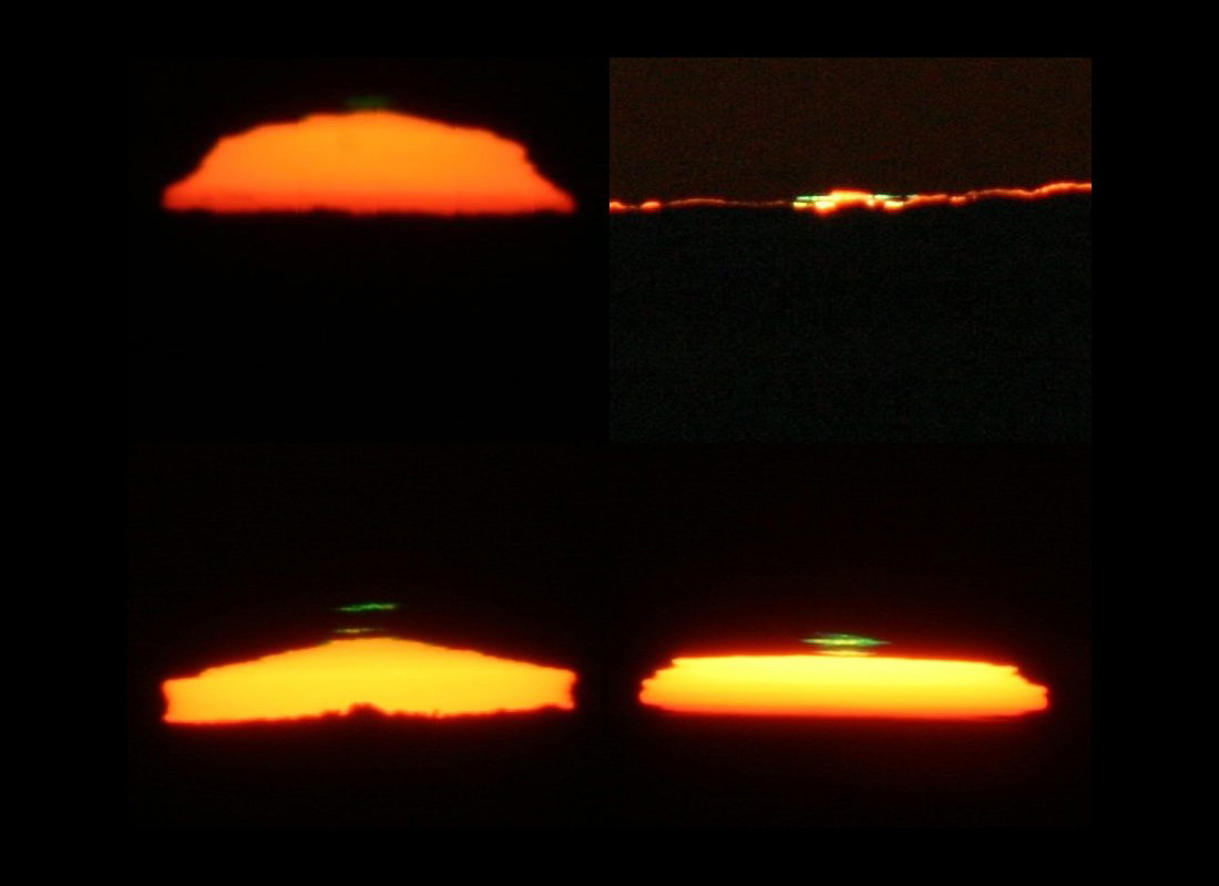 Mosaico de cuatro rayos verdes fotografiados en noviembre y diciembre de 2003 en el norte de Chile (Las Campanas, Cerro Paranal y La Silla).