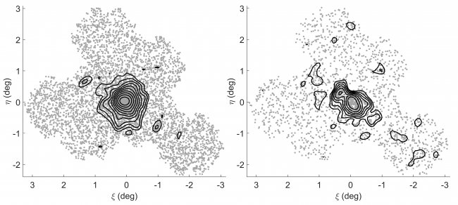 Distribuciones espaciales de las dos poblaciones estelares analizadas en Sextans. A la izquierda: estrellas azules (pobres en metales). A la derecha: estrellas rojas (ricas en metales).Créditos: Cicuéndez, L. y Battaglia, G.