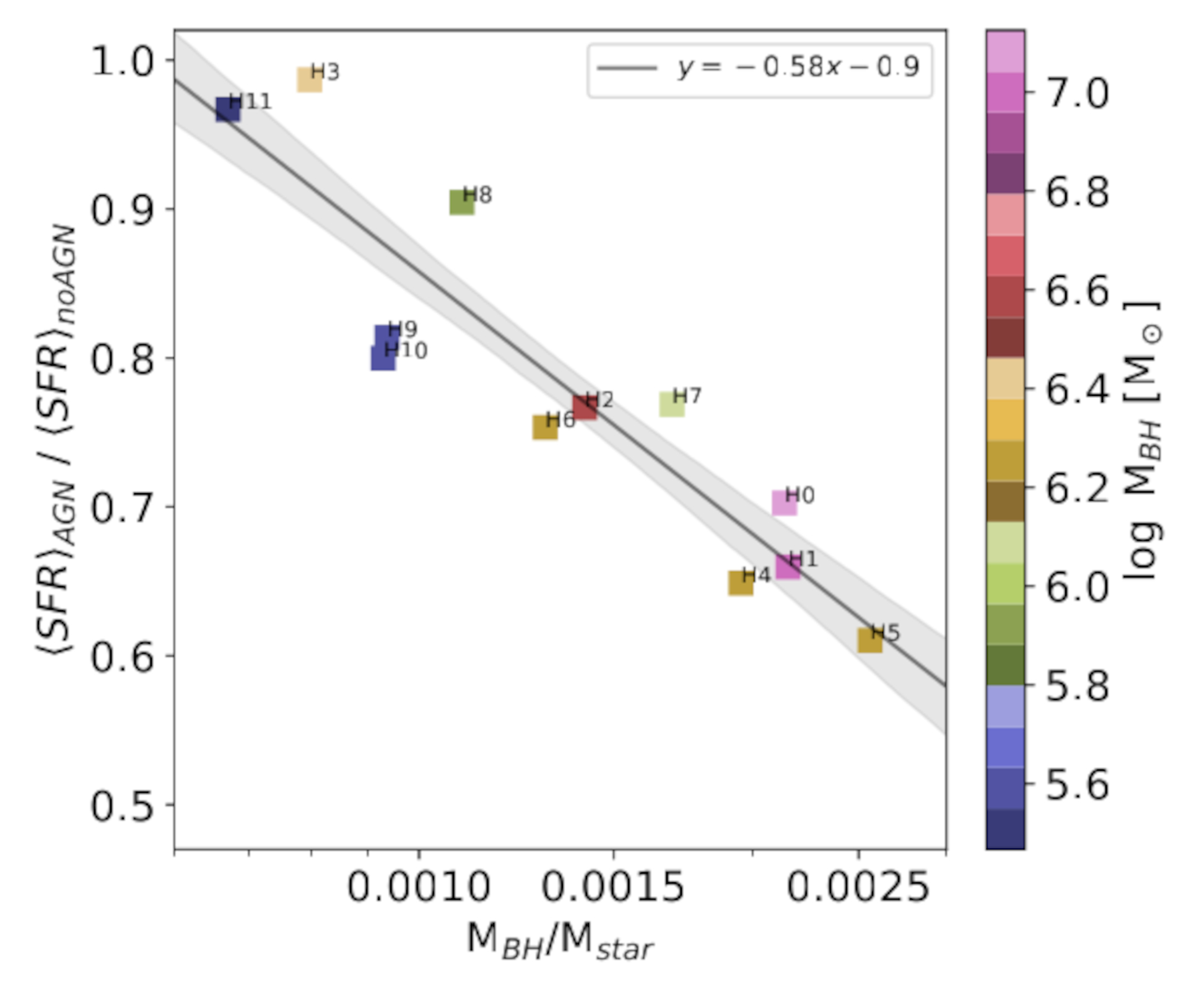 Relación entre la tasa de formación estelar (SFR) media en galaxias con y sin AGN, mostrada en función de la relación entre la masa del agujero negro (BH) y la masa estelar de las galaxias simuladas. Las galaxias con agujeros negros sobremasivos presentan una mayor supresión en la formación estelar.