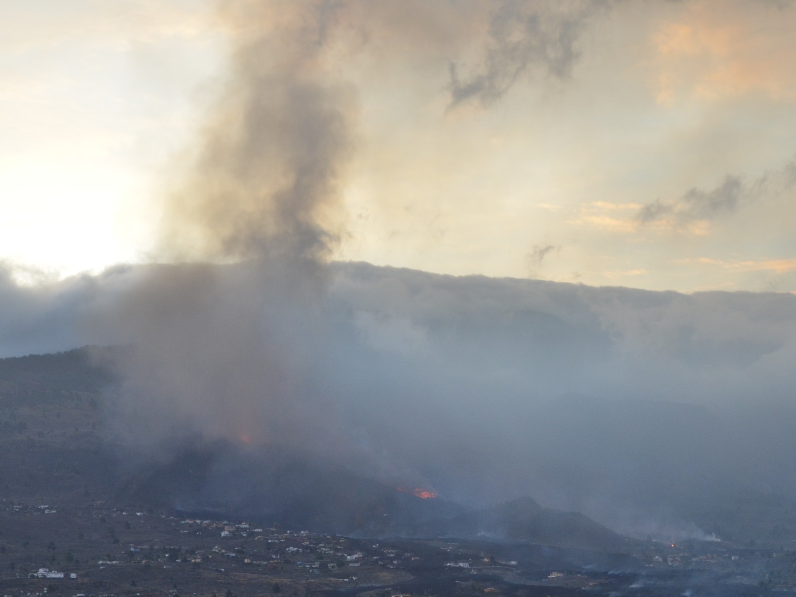 El volcán de Cumbre Vieja al amanecer, utilizando el espectro visible (imagen tomada con una cámara Nikon). Crédito: Sara González y Carlos Colodro (IACTEC Espacio)