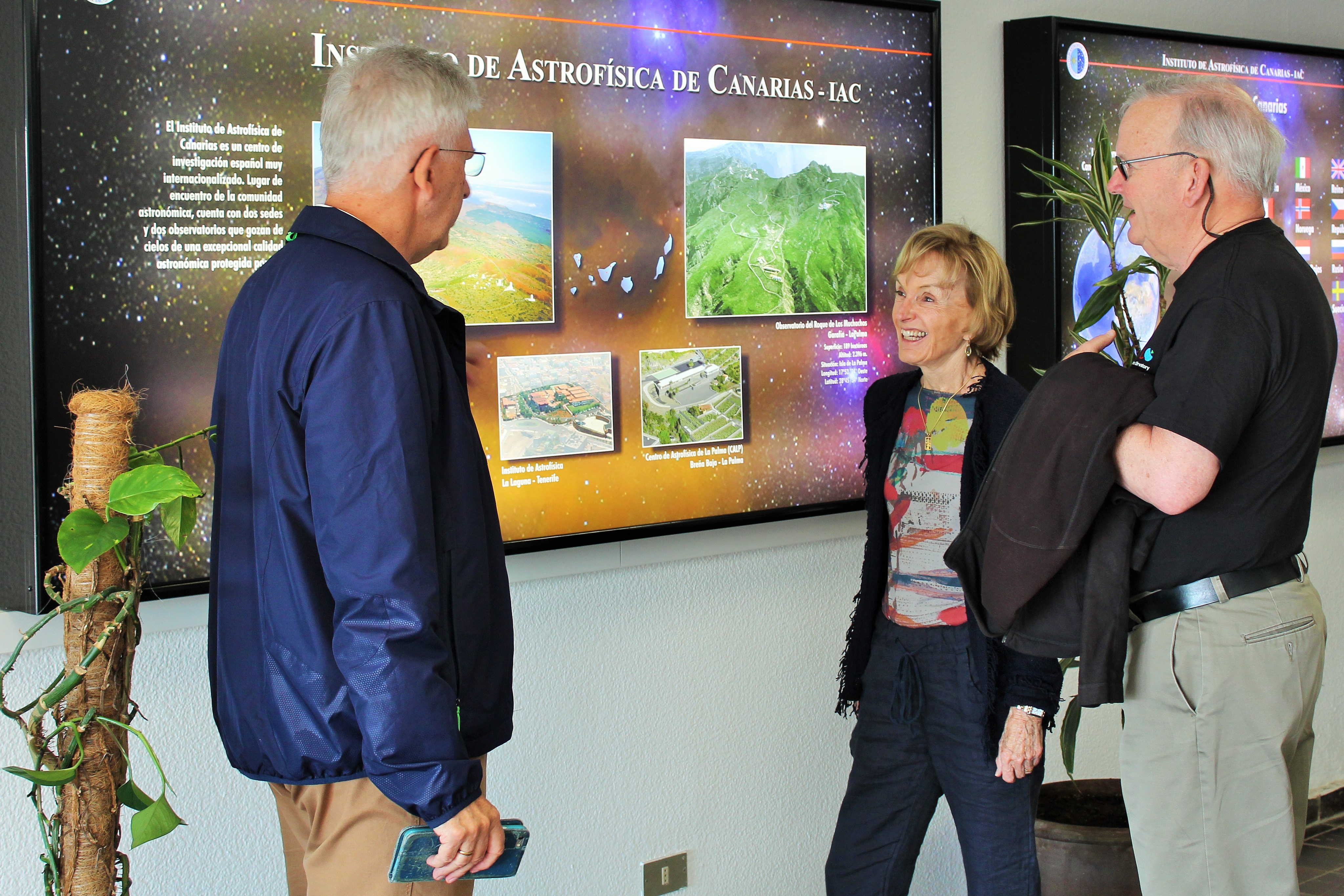 Wayne Rosing y Dorothy Largay durante su visita a la sede del IAC en La Laguna. Tras ellos, el panel explicativo sobre las sedes y los observatorios del IAC. Crédito: Alejandra Rueda Moral (IAC).