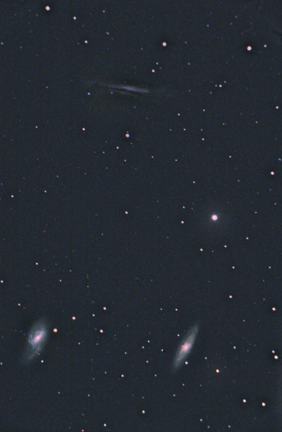 The Leo Triplet of interacting spiral galaxies, M65 (in the right lower parte of the image), M66 (down left) and NGC3628 (in the upper part of the image).