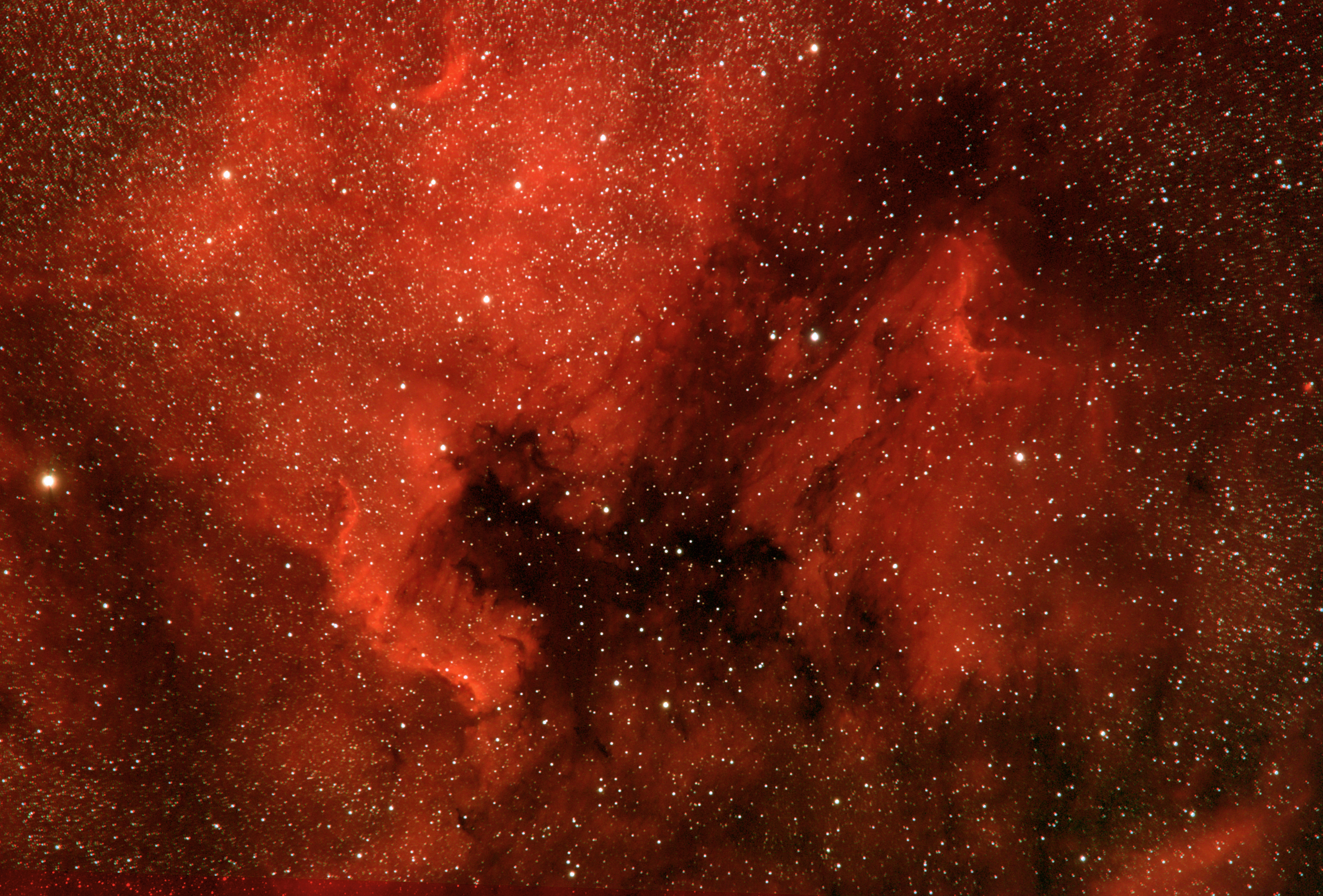 This large nebular complex is famous partly because it resembles Earth's continent of North America. It was discovered in the early 1890s by Max Wolf. To the right of the North America Nebula, catalogued as NGC 7000, is a less luminous Pelican Nebula, designated IC 5067-70. The two emission nebula measure about 50 light-years across, are located about 1500 light-years away, and are separated by a dark absorption cloud designated LDN 935 which is also part of the whole nebula complex.