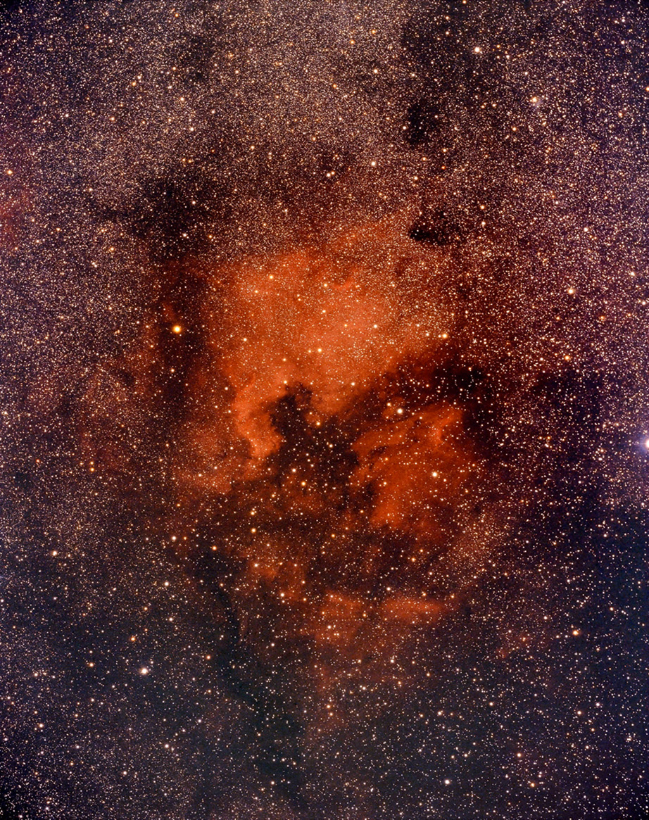 Nombre del Objeto ? NGC 7000 e IC 5070. Tipo de Objeto ? Regiones Halfa. Coordenadas Ecuatoriales J2000.0 ? 20h 58m 47s; 44° 19? 48\\". Tamaño ? 50 años-luz. Distancia ? 1.500 años luz. Constelación ? Cisne. La imagen muestra un mosaico del complejo de nebulosas de emisión Norteamérica y Pelícano (NGC 7000 e IC 5070) situado en la constelación del Cisne. La primera de ellas, en la parte izquierda, se denomina de esta forma por su semejanza con el continente norteamericano, mientras que la segunda, en la parte derecha, muestra una extraña semejanza con un pelícano. A pesar de parecer dos nebulosas independientes, realmente forman parte de la misma nebulosa. La razón de esta separación aparente se encuentra en una región muy densa de material interestelar situada delante de ellas que absorbe la luz de las mismas. Esta región se puede apreciar en el centro de la imagen como un \\"hueco\\" muy oscuro que incluso tapa la luz de estrellas débiles. Este gigantesco complejo nebular está formado principalmente por hidrógeno ionizado, mide aproximadamente 50 años-luz y dista de la Tierra unos 1.500 años-luz. Además, forma parte de una de las mayores concentraciones de material interestelar de la Vía Láctea. Es posible distinguir débilmente ambas nebulosas con unos prismáticos, aunque es a través de fotografías de larga exposición y, sobre todo, al uso de filtros Halfa cuando salen a relucir los finos detalles que muestra la foto.