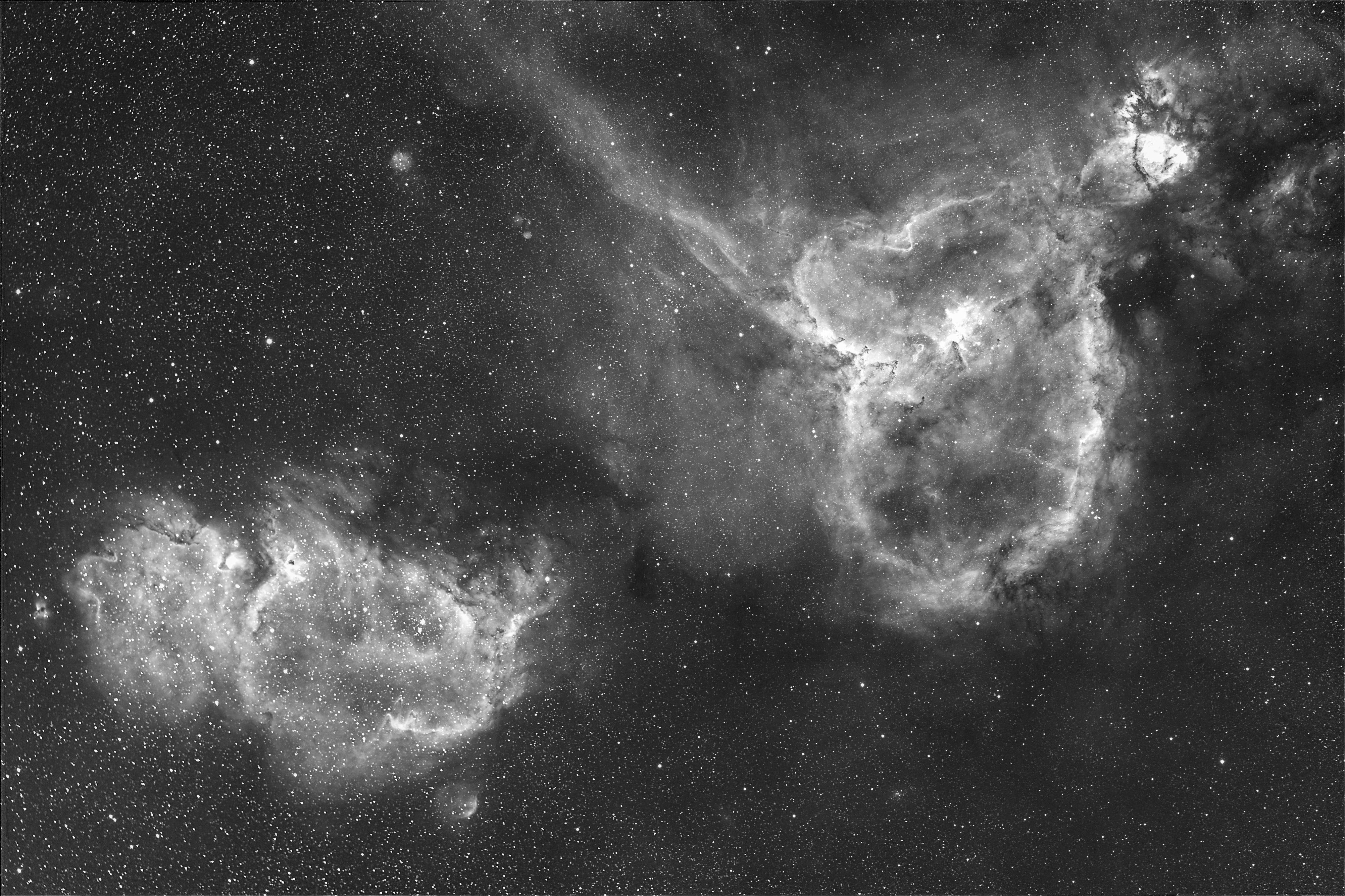 Con este romántico nombre se conoce a este par de nebulosas de emisión en la constelación de Cassiopeia, en pleno brazo de Perseo de nuestra galaxia, a unos 7500 años luz. Formadas por plasma de hidrógeno ionizado, entre ambas constituyen un enorme complejo nebular de unos 600 años luz de extensión. El Corazón, a la derecha (IC 1805 o Sh2-190) cubre más de dos grados de cielo y muestra numerosos surcos de polvo interestelar, material distinto al hidrógeno y al helio, que absorbe la luz visible que emite la nebulosa. En ésta destaca NGC 896, una zona de formación estelar muy activa y brillante, arriba a la derecha; es la parte más brillante de todo el campo y la primera zona de la nebulosa en ser descubierta. En el centro del Corazón se encuentra Melote 15, un cúmulo abierto formado por estrellas gigantes de tipo O y B cuya radiación empuja el gas y el polvo y hacen brillar a la nebulosa.