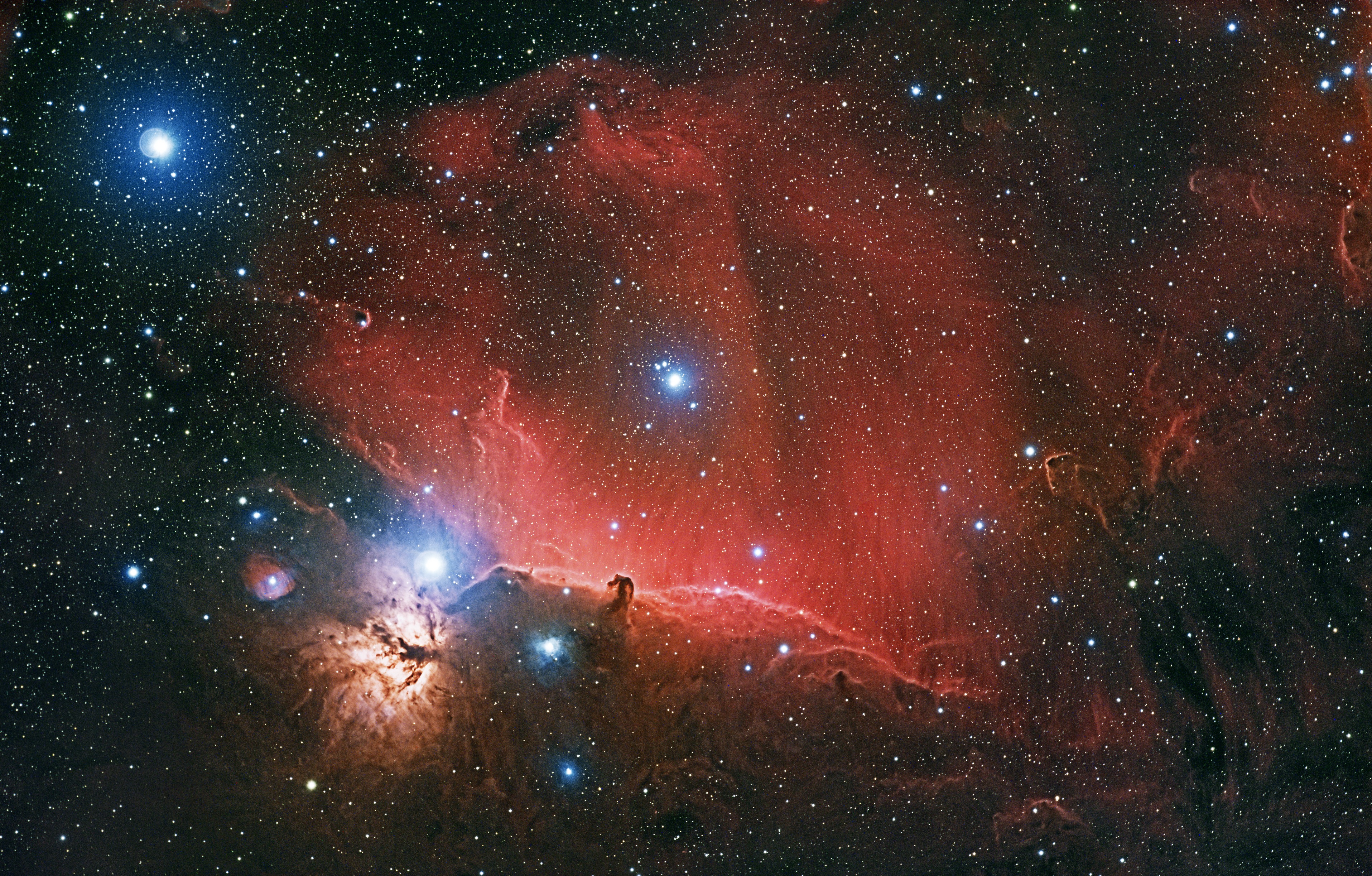 Justo al sur de la estrella Alnitak (Zeta Orionis, en árabe significa \\"la faja\\") se encuentra el complejo nebular que contiene la famosa nube molecular de la \\"Cabeza de Caballo\\". Esta región de formación de estrellas está situada a unos 1500 años luz de la Tierra, y está integrada en el enorme complejo nebular de Orión. Es visible por el contraste entre su polvo oscuro y la nebulosa de emisión IC 434. A diferencia de la brillante luz roja de H-alfa de IC 434, la luz azul de la nebulosa de reflexión NGC 2023 (un poco a la izquierda y debajo de la IC434) es producida por la radiación energética proveniente de una estrella joven de tipo espectral B, nacida en la nube de gas y polvo. El viento estelar y la presión de radiación de esta estrella está horadando una cavidad extensa dentro de la nube. Justo a su izquierda se encuentra la Nebulosa de la Llama. Esta vez es la propia Alnitak la que ilumina la Llama. Su radiación energética despoja electrones de los átomos de las grandes nubes de hidrógeno que se encuentran a su alrededor. La mayor parte de la luz roja que vemos en la imagen se produce cuando los electrones y el hidrógeno ionizado se recombinan.