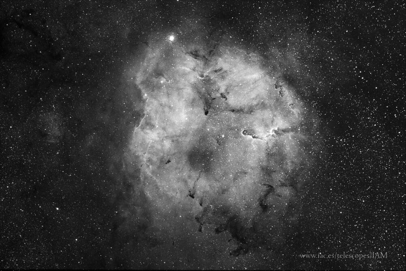La imagen de este mes se ve en blanco y negro porque está tomada con un filtro de hidrógeno alfa que sólo permite pasar un rango muy estrecho de luz centrado en 656nm, justo el que emite la nebulosa ionizada por HD 206267, permitiendo mostrar con mejor contraste los más pequeños detalles.