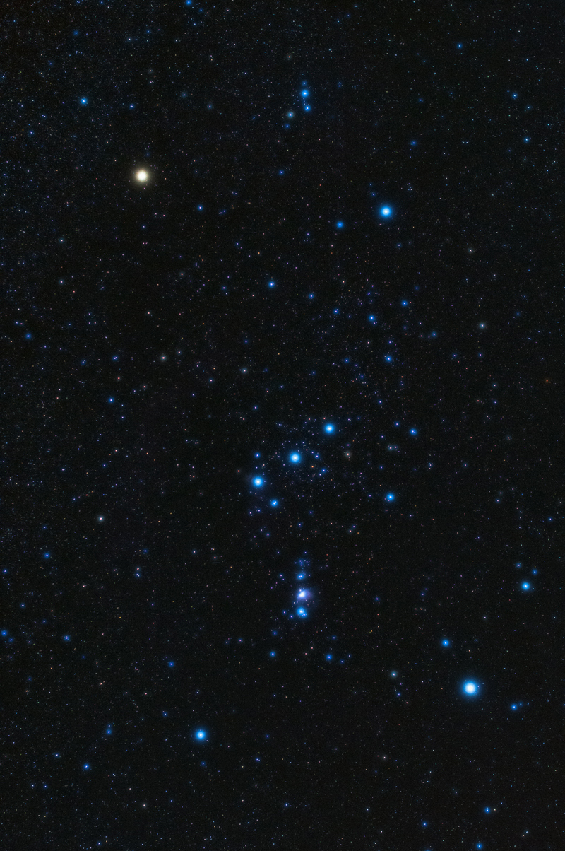 La constelación de Orión, el cazador, es una de las más impresionantes del cielo, así como una de las más fácilmente localizables. Con numerosos objetos de gran belleza en su interior, a simple vista destacan la estrella Betelgeuse, de color rojo, el famoso cinturón de Orión con las tres maría: Mintaka, Alnilam y Alnitak y, bajo el cinturón, Rigel, otra de las estrellas más llamativas del cielo.