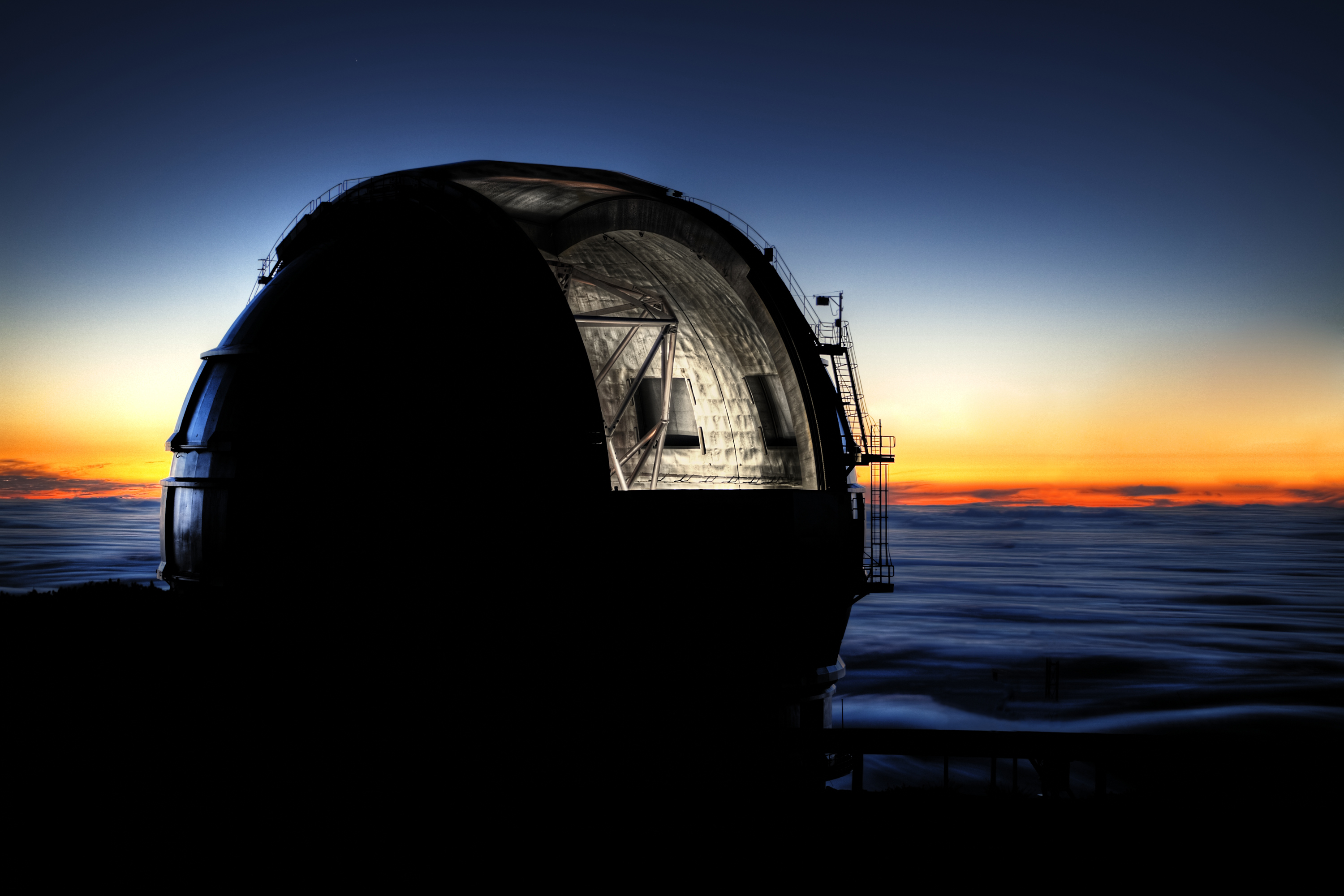 El Gran Telescopio CANARIAS (GTC), con la cúpula abierta al atardecer.