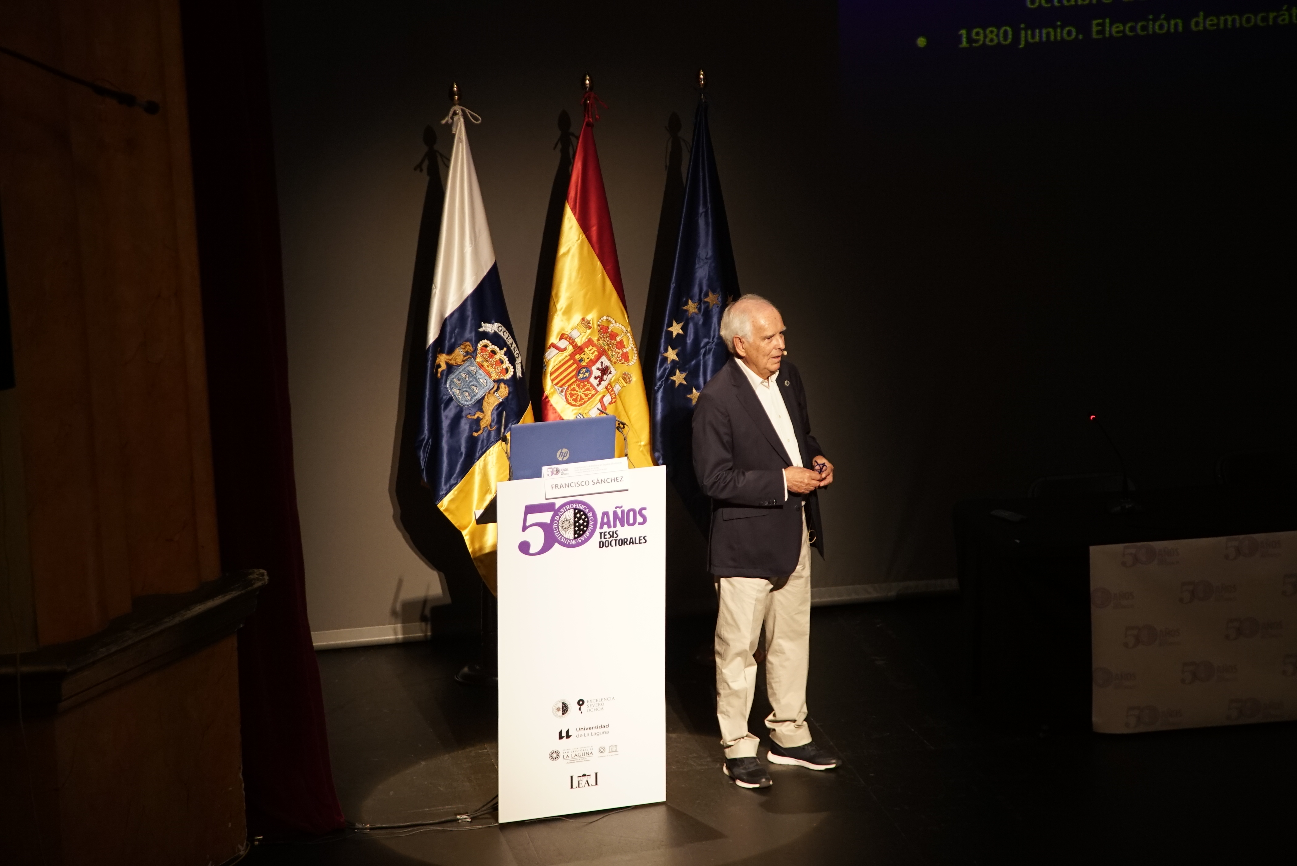 Franciso Sánchez during his lecture "DREAMING STARS. Thus Astrophysics in Spain was born and consolidated" at the Teatro Leal in La Laguna, which inaugurated the congress "Promoting Astrophysics in Spain: 50 years of doctoral theses at the IAC".
