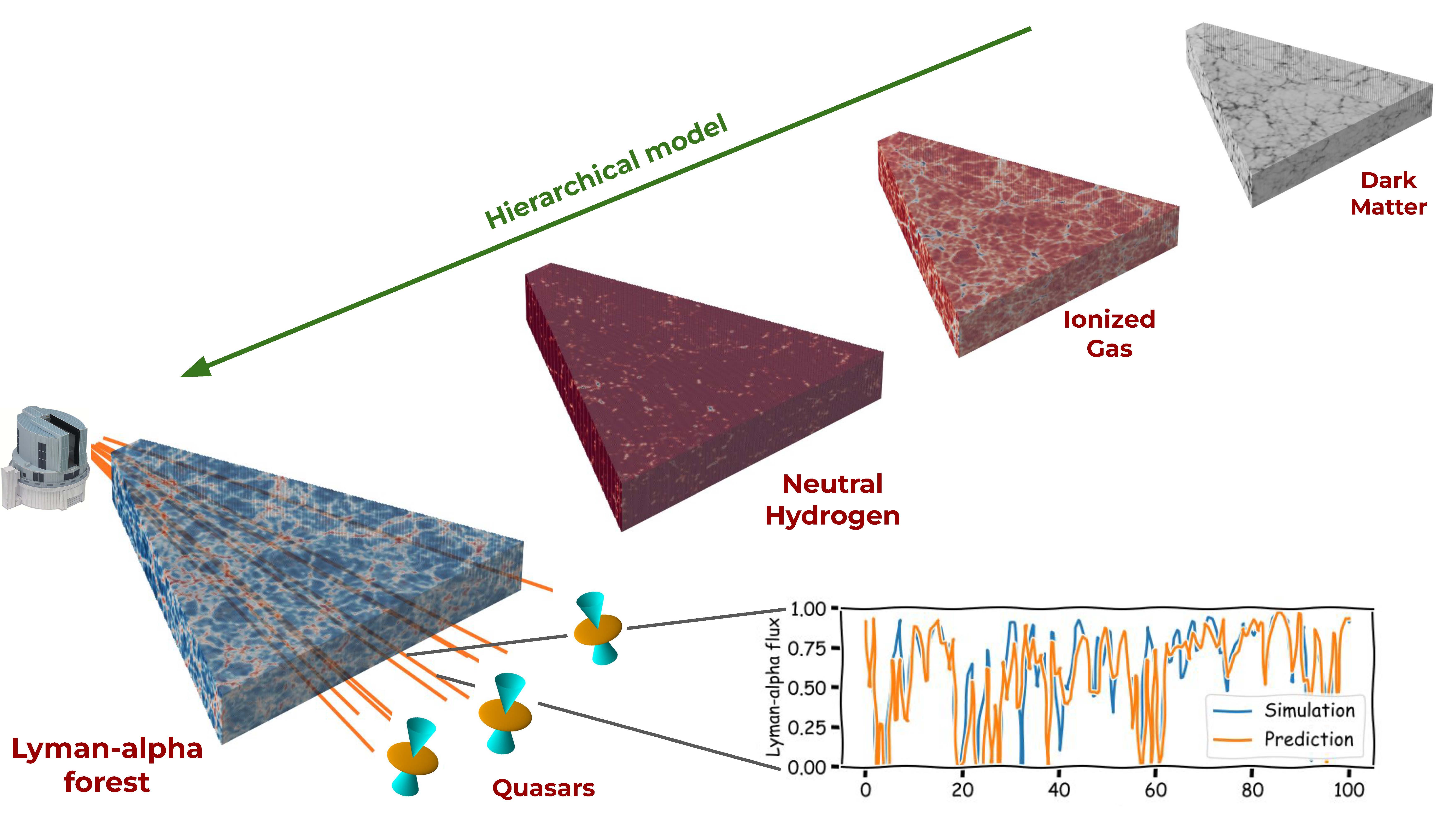 Representation of the hierarchical model of the ingredients that make up the large-scale Universe. The connections between the quantities of intergalactic gas, dark matter and neutral hydrogen allow us to predict, thanks to the computational model developed, the absorption flow of the Lyman-alpha forest, a pattern of lines in the spectra of distant galaxies and quasars that is produced when the light emitted by these objects is absorbed, along its path, by clouds of hydrogen gas. Credit: Francesco Sinigaglia