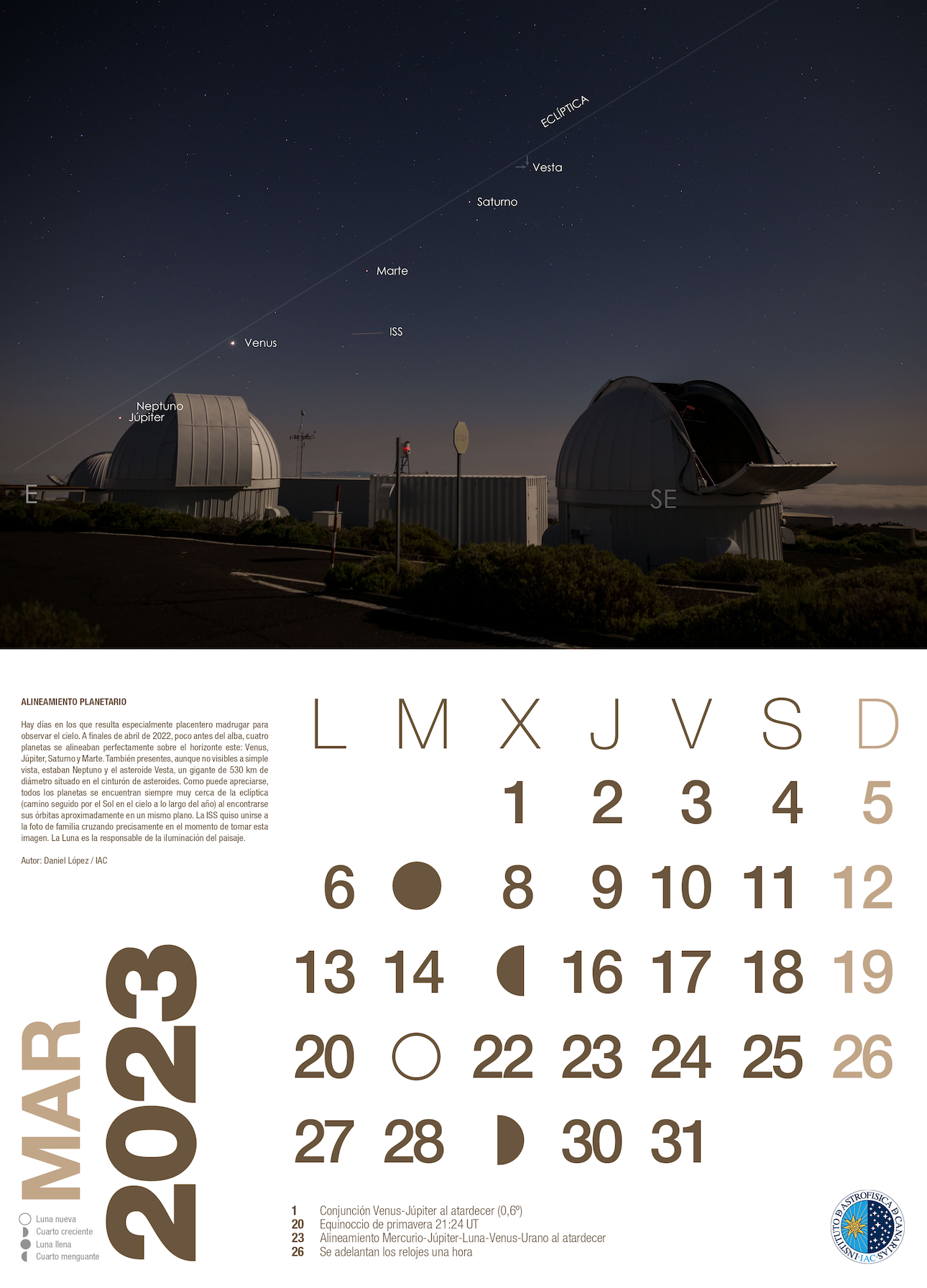 There are days when it is especially pleasant to get up early to observe the sky. At the end of April 2022, shortly before dawn, four planets lined up perfectly on the eastern horizon: Venus, Jupiter, Saturn and Mars. Also present, but not visible to the naked eye, were Neptune and the asteroid Vesta, a giant 530 km in diameter located in the asteroid belt. As can be seen, all the planets are always very close to the ecliptic (the path of the Sun across the sky throughout the year) as their orbits lie approximately in the same plane. The ISS wanted to join the family photo by crossing precisely at the moment this image was taken. The Moon is responsible for the illumination of the landscape.