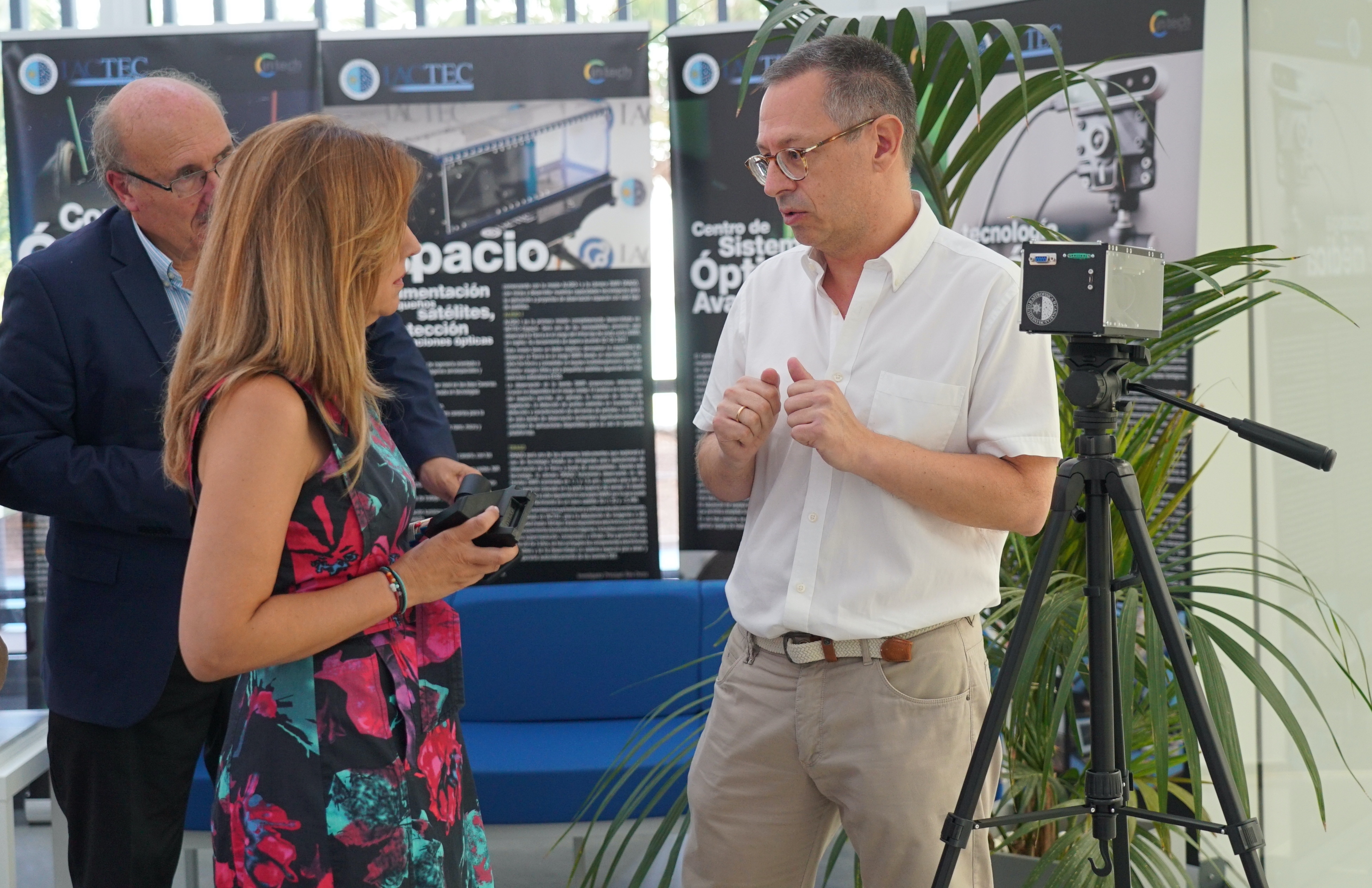 La presidenta del Cabildo de Tenerife, Rosa Dávila, habla con el investigador principal de IACTEC-Espacio, Álex Oscoz, sobre la cámara infrarroja DRAGO, a la derecha de la imagen. Crédito: Alejandra Rueda (IAC).