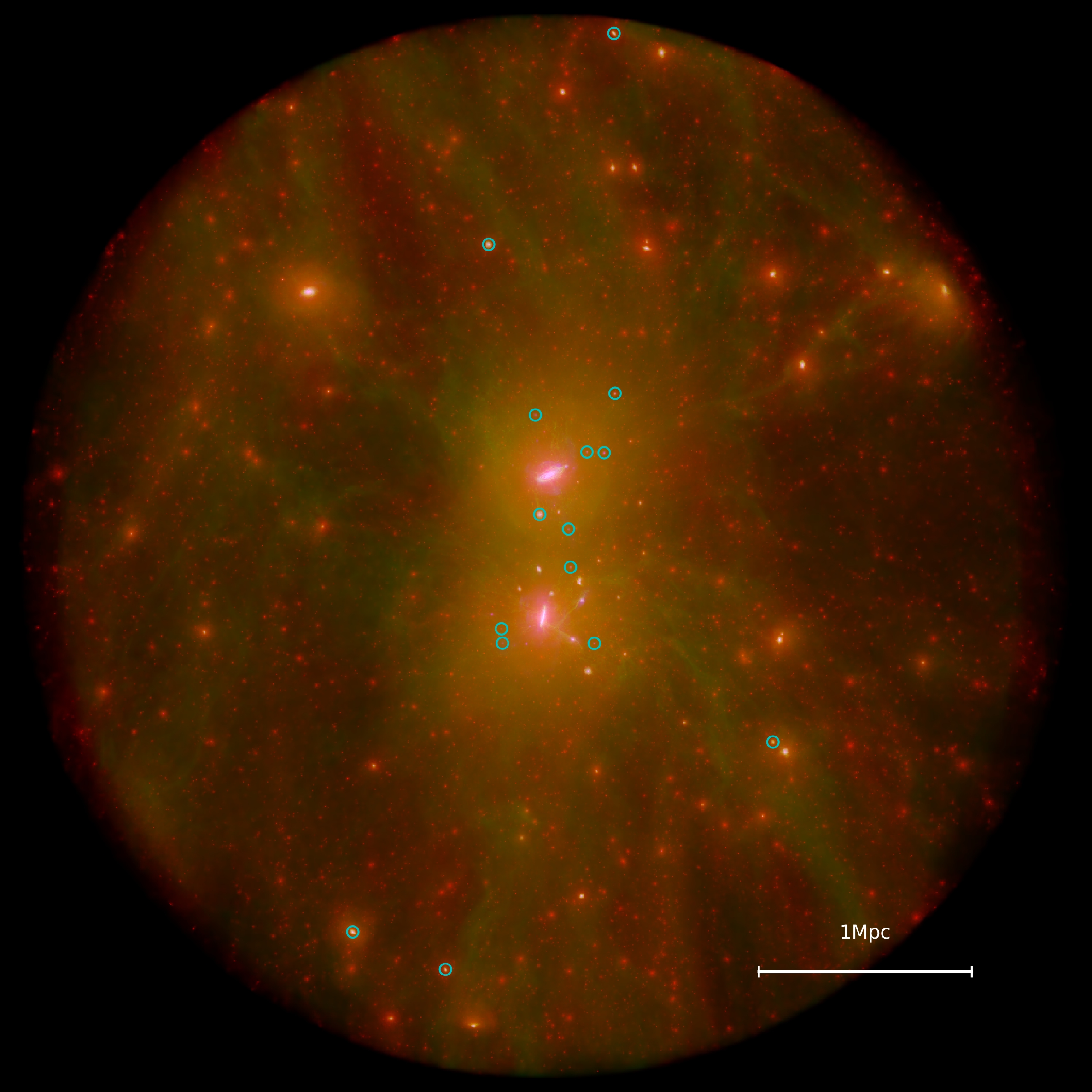 A numerical simulation of the local group of galaxies, from the HESTIA project. The dark matter distribution is shown in red, the gas in green, and the stars that make up the galaxies in white. The two central galaxies correspond to our Milky Way and Andromeda, while ultra-diffuse galaxies that have not yet been discovered are indicated by green circles.
