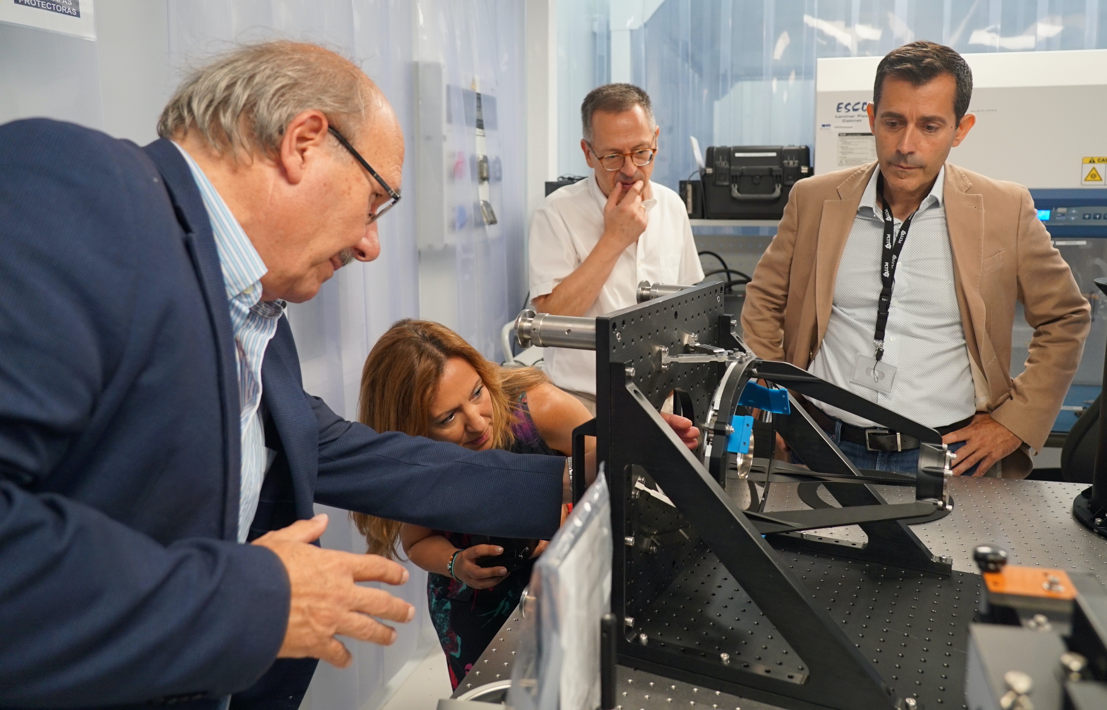 Rosa Dávila, presidenta del Cabildo de Tenerife, y Juan José Martínez, consejero de Innovación, Investigación y Desarrollo, visitaron las salas limpias donde se desarrolla la tecnología espacial en el edificio de IACTEC. En la imagen, de izquierda a derecha: Rafael Rebolo, director del IAC, Rosa Dávila, presidenta del Cabildo de Tenerife, Alex Oscoz, investigador principal de IACTEC-Espacio; y Juan José Martínez, consejero de Innovación, Investigación y Desarrollo. Crédito: Alejandra Rueda (IAC).