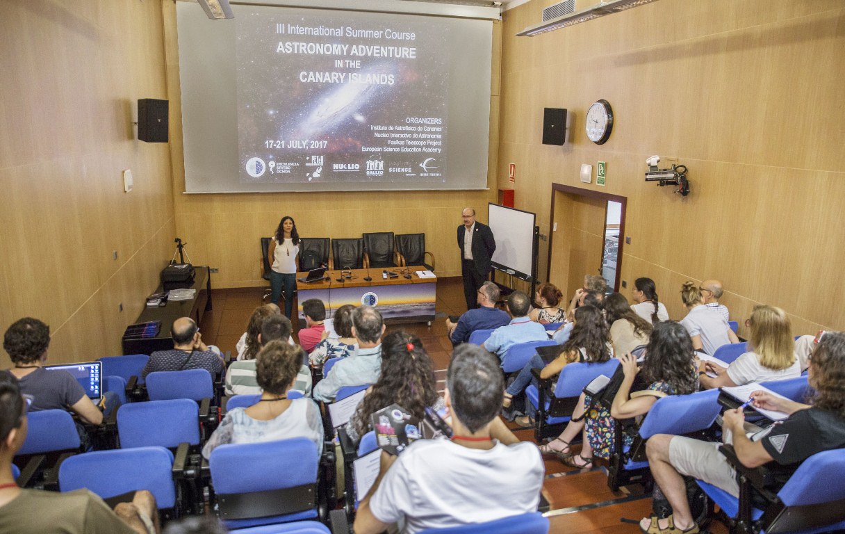 La formación de profesorado, tanto en temas de Astronomía y Astrofísica como en métodos y herramientas de aprendizaje activo, es otro de los puntos clave de PETeR. Desde 2015, hemos formado a más de 250 docentes de España y también de otros países europeos en los diferentes cursos organizados en el marco de PETeR o en los que participamos en colaboración con otras organizaciones educativas como NUCLIO [5], los proyectos FTP, NSO y CESAR [6] o la Consejería de Educación del Gobierno de Canarias. Entre ellas, destacamos el curso internacional de verano “Astronomy Adventure in the Canary Islands”, que en 2019 cumple su quinta edición consecutiva [*]. Se trata de una semana de formación intensiva con un enfoque altamente práctico y que incluye visitas formativas a los Observatorios de Canarias.