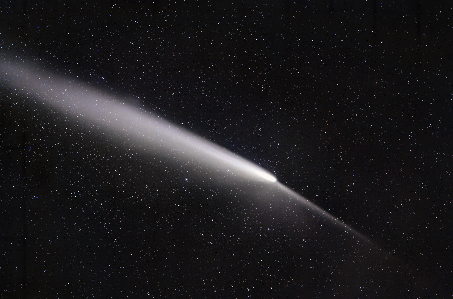 Esa madrugada el cometa estaba situado a unos 113 millones de kilómetros. Con una cola de aproximadamente 14 grados, pudimos estimar su longitud proyectada en alrededor de 28 millones de kilómetros de longitud, seguramente más de 30 millones reales. Eso es más de 2.300 veces el diámetro terrestre, o una distancia que bien merece ser medida en segundos-luz: ¡100 segundos-luz! Un tamaño realmente espectacular si pensamos que son los restos de un bloque de hielo de tan solo una decena de kilómetros de diámetro aproximadamente.