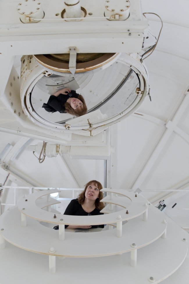 La escritora Ángela Vallvey, en la torre solar alemana (VTT), del Observatorio del Teide (Izaña, Tenerife). Crédito: Elena Mora (IAC).