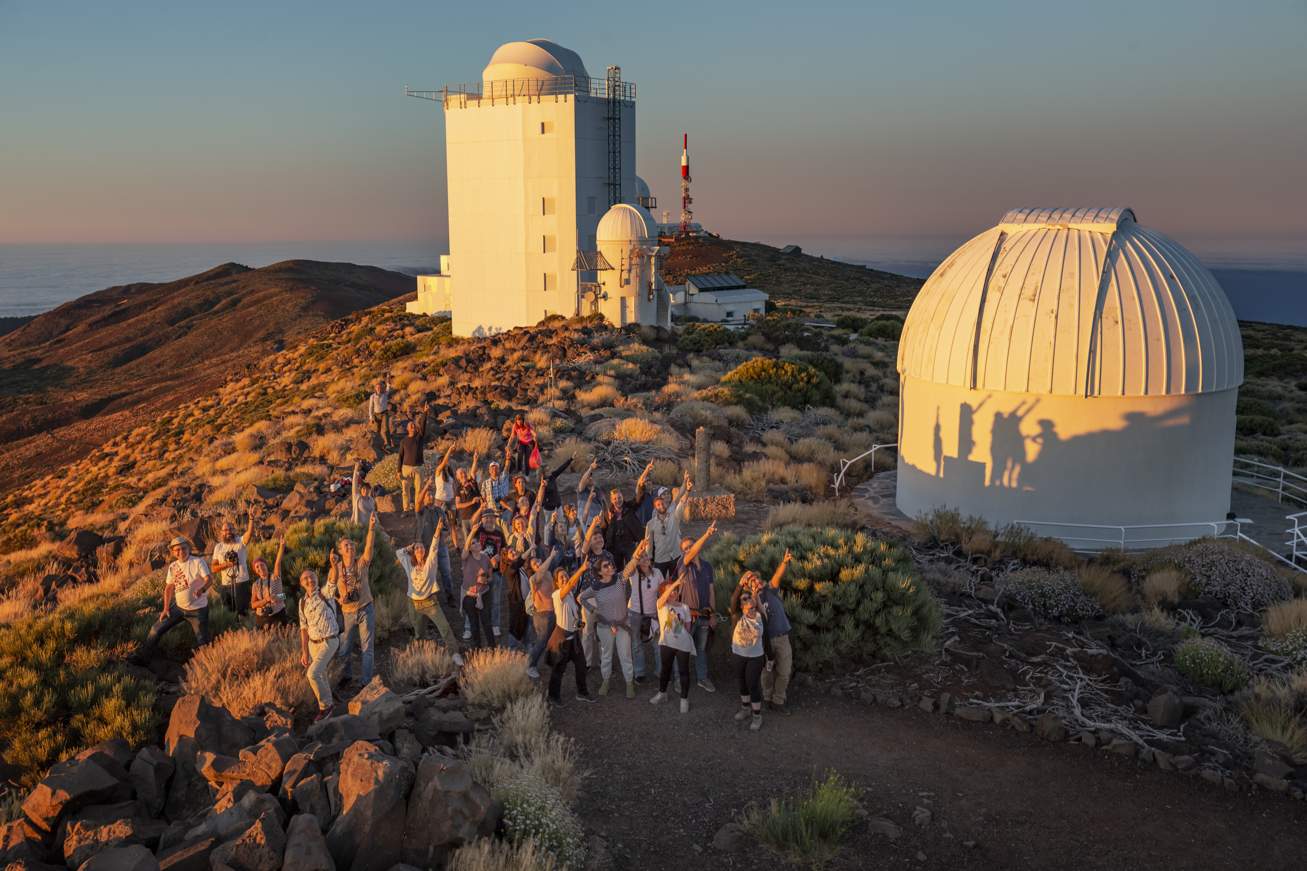 Asistentes al curso "Acércate al Cosmos" 2022 la tarde de su visita al Observatorio del Teide, con las torres solares de fondo. Crédito: Daniel López / IAC.