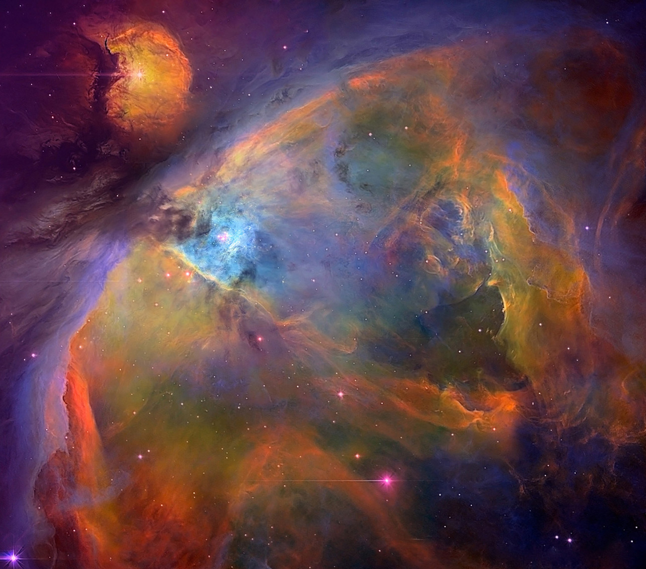 La parte más conocida de esta nebulosa es el Trapecio, cuatro estrellas masivas brillantes situadas en el corazón de Orión que iluminan el gas cercano con luz ultravioleta muy energética.