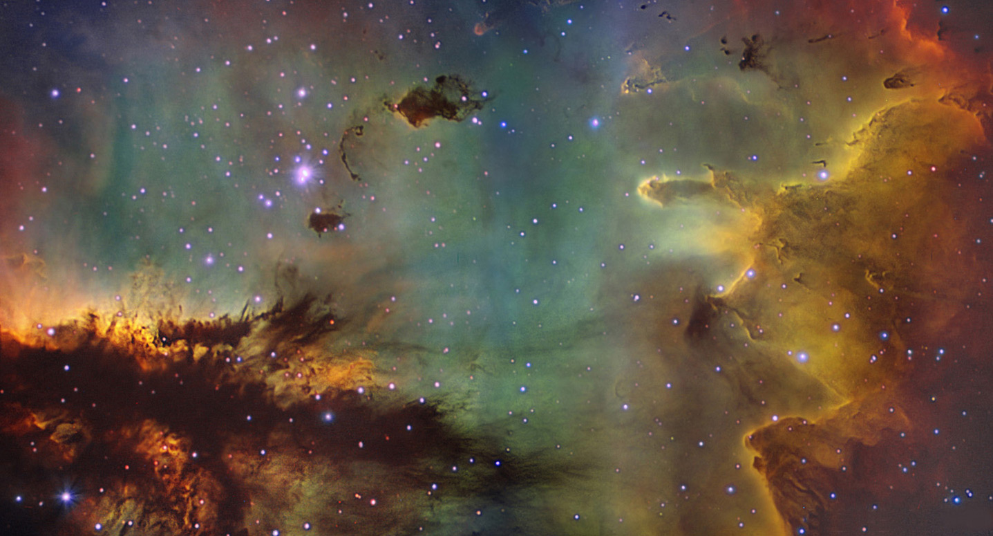 Nombre del Objeto ? NGC281. Tipo de Objeto ? Nebulosa de emisión. Coordenadas Ecuatoriales J2000.0 ? 00h 52m 54,0s; 53° 33\' 51,0\\". Distancia ? 5.500 años luz. Constelación ? Casiopea. La imagen de este mes muestra una región de la nebulosa NGC281, también conocida coloquialmente como la nebulosa de pacman, el famoso comecocos del videojuego, debido a la nube molecular oscura que aparece con forma de boca en la parte izquierda de la imagen. Por otro lado, se puede observar que la parte derecha de la imagen recuerda claramente a M16, mostrando inmensos pilares formados por zonas más densas que el resto de la nube que resisten el paso del frente de la radiación ionizante que acaban emergiendo como zonas aisladas en la región HII. Esta nebulosa, igual que M16, puede considerarse como una ?guardería estelar? de gran interés científico al tratarse de una región de formación estelar en las zonas de transición entre regiones ionizadas HII y nubes moleculares. La foto está compuesta por un mosaico de dos imágenes y su tamaño real es de unos 35?x30? con una magnitud de 7,4.