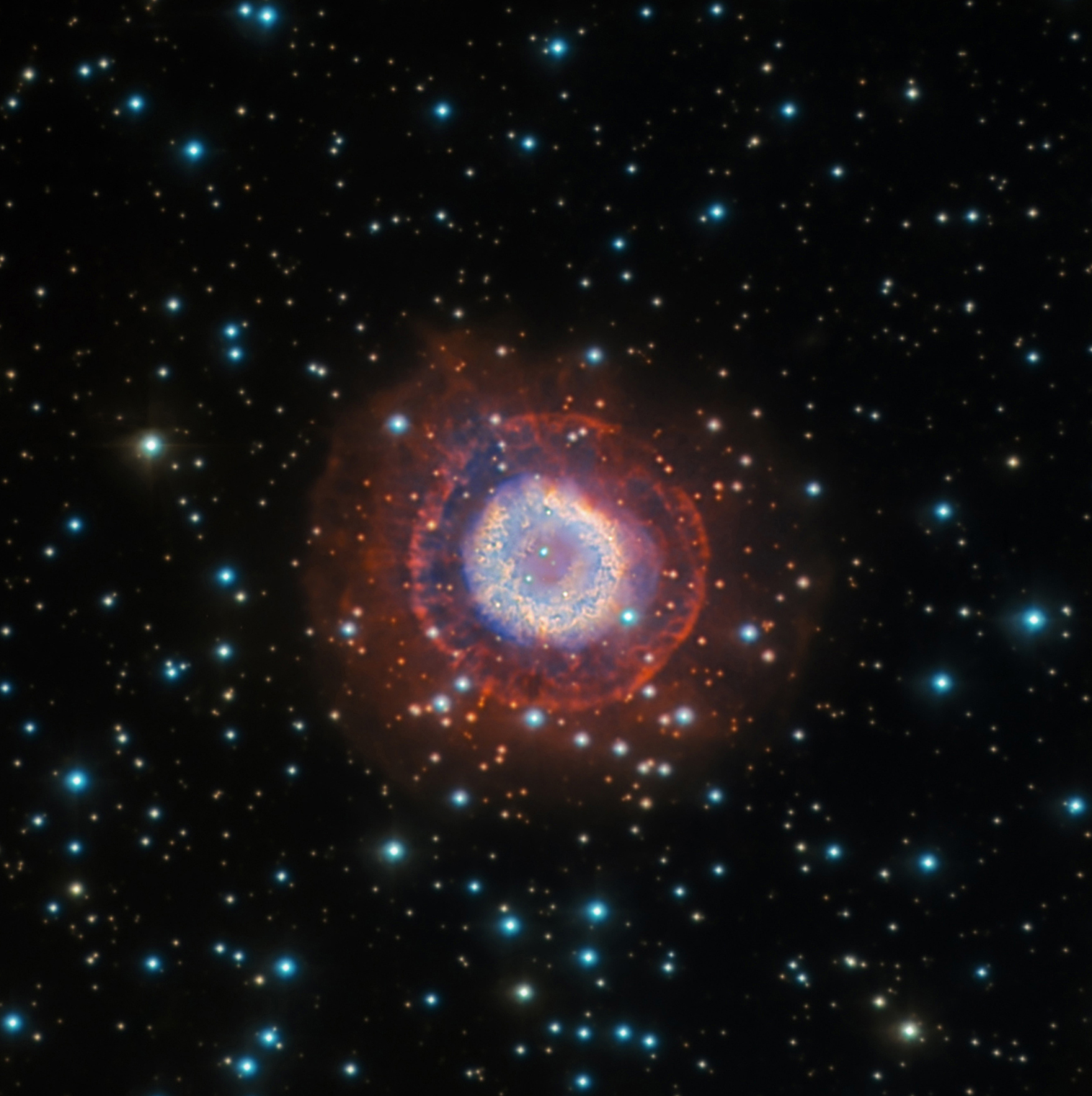Una de las peculiaridades de esta imagen, obtenida usando filtros estrechos, es que muestra una gran estructura en forma de halo alrededor del anillo principal. El halo, muy difícil ver en otras imágenes, es especialmente visible usando los filtros Halfa y parte de [OIII]. Esta estructura es muy parecida a la que muestra M57, que no comenzó a plasmarse en imágenes hasta hace relativamente pocos años, y eso gracias al uso de filtros estrechos y largos tiempos de exposición.
