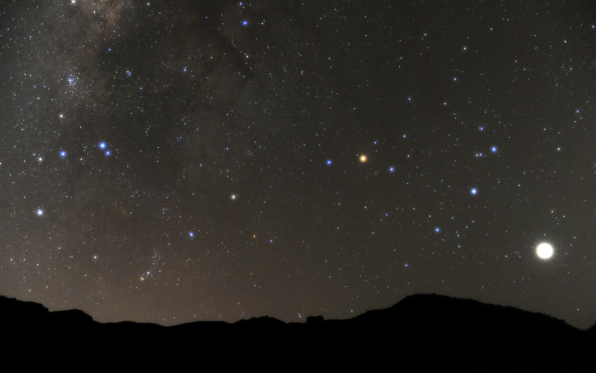 Constelación del Escorpión sobre el anfiteatro de Las Cañadas del Teide. El objeto brillante a la derecha de la imagen es el planeta Venus.