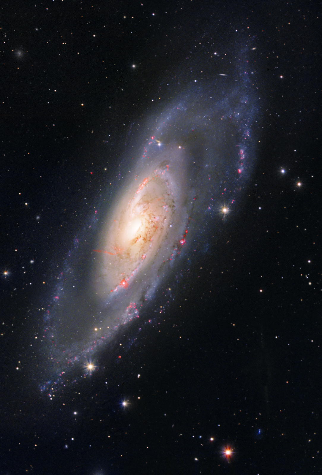 La galaxia M106 (también conocida como NGC 4258) puede encontrarse en la constelación de Canes Venatici, muy cerca de la Osa Mayor. Fue descubierta en 1781 por el astrónomo francés Pierre Mechain, e incluida más tarde en el famoso catálogo de su colega Charles Messier. M106 es una galaxia espiral de alrededor de 30 mil años luz de diámetro, situada a unos 21 millones de años luz de nuestro planeta. La IAM de este mes muestra su estructura intrincada, con franjas de polvo prominentes, un núcleo central brillante, y una gran cantidad de guarderías estelares de color rojo que trazan los brazos espirales de la galaxia. Estos últimos han sido acuñados como \\"brazos anómalos\\" por muchos autores (véase, por ejemplo, Wilson, Yang