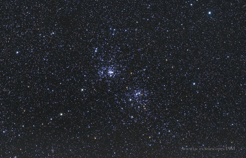 La famosa pareja de cúmulos h y ? Persei es uno de los mejores ejemplos de cúmulos galácticos y una auténtica joya para la observación con telescopios pequeños. Situados en la constelación de Perseo, en plena Vía Láctea y cerca de Casiopea, se conocen desde muy antiguo, ya que Hiparco y Ptolomeo los mencionan en sus escritos alrededor del año 150 A.C. Ambos cúmulos, denominados también NGC 869 (h Persei) y NGC 884 (? Persei), que en cielo solo están aparentemente separados medio grado, también lo están físicamente. Sus distancias al Sol son de 7.600 y 6.800 años luz, respectivamente, mientras que entre sí solamente distan 65 años luz. Durante las últimas décadas los astrónomos han realizado un gran esfuerzo por estudiar los cúmulos abiertos para entender la evolución estelar en poblaciones estelares y h/? Persei constituye uno de los modelos más importantes. Ya que tanto sus masas, calculadas en 3.700 M? (h) y 2.800 M? (?), como sus edades, de 11,8 y 12,8 millones de años, son muy similares, muestran que se trata de un auténtico cúmulo doble, que ha sobrevivido diez millones de años después de que se disiparan los gases con los que se formaron. En esta imagen de gran campo vemos cómo ambos cúmulos están dominados por estrellas gigantes azules y blancas, de las que cada cúmulo posee más de 300. También destaca la gran cantidad de estrellas de campo en esta zona del cielo, incluyendo algunas llamativas estrellas M rojas más cercanas, y casi todas forman parte del brazo de Perseo de nuestra Galaxia.