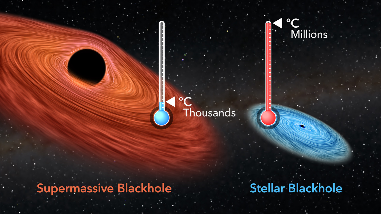 Ilustración artística de un frio y pesado agujero negro situado en el centro de una galaxia, con 100 millones de veces la masa de nuestro Sol, calentando su entorno a miles de grados, en comparación con un agujero negro estelar, más pequeño y supercaliente, con decenas de veces la masa de nuestro Sol, pero capaz de calentar su entorno a millones de grados. Crédito: Gabriel Pérez Díaz (IAC)