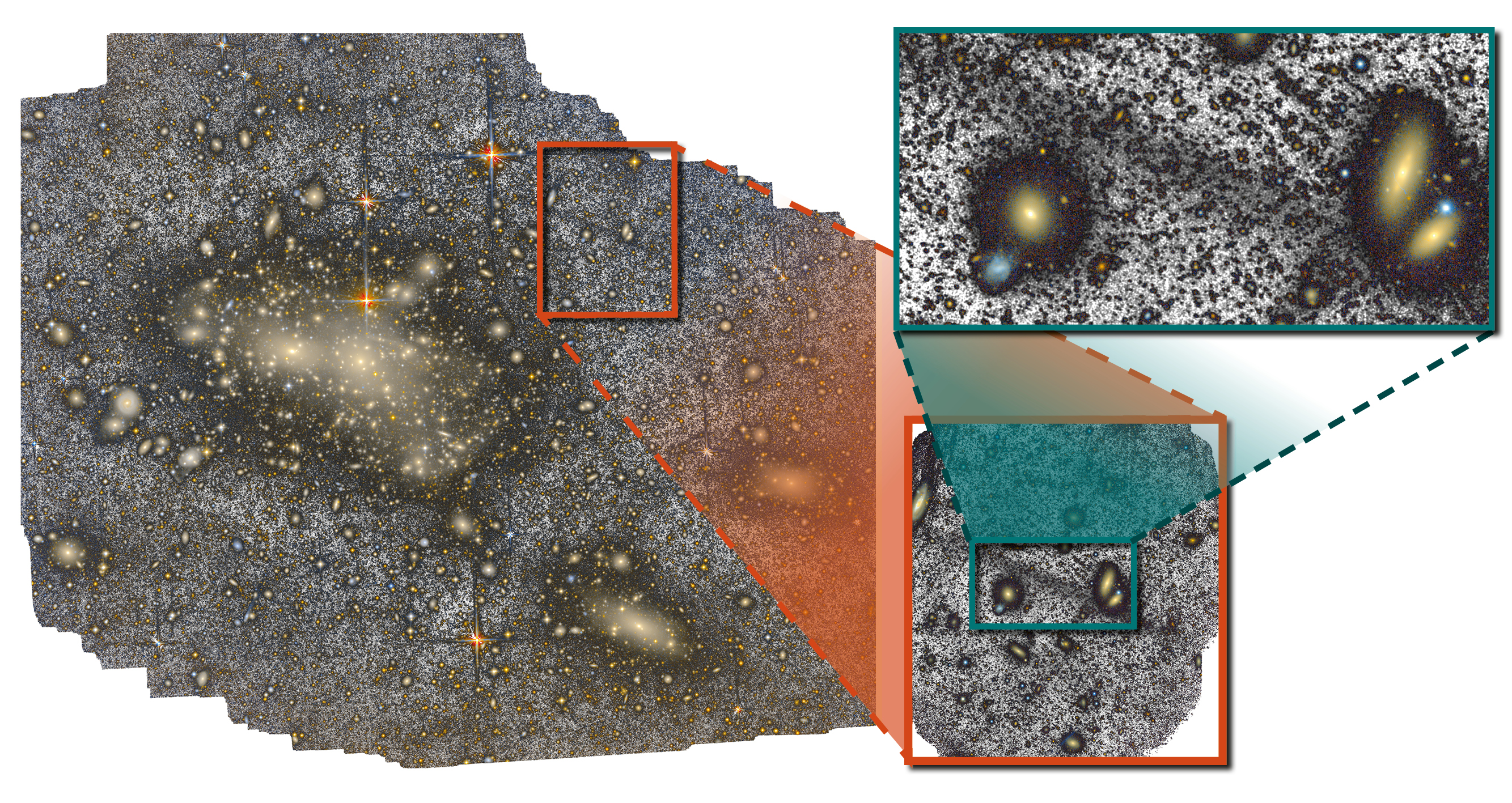 Imágenes obtenidas con los telescopios Jeanne Rich (HERON) y William Herschel (WHT) en las que se aprecian la denominada ‘corriente gigante de Coma’, una corriente estelar (línea oscura) diez veces más larga que la Vía Láctea y que se extiende entre galaxias (a color) a unos 300 millones de años luz. Crédito: HERON/ WHT/ Román et al. Diseño: Inés Bonet (IAC)