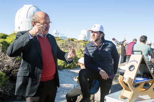 El director del IAC, Rafael Rebolo, junto al presidente del Cabildo de Tenerife, Carlos Alonso durante la presentación del proyecto "CosmoLAB: el Sistema Solar como laboratorio en el aula" en el Observatorio del Teide. Crédito: IAC.