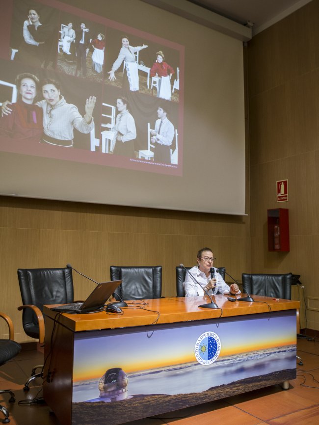 Intervención de Helena Romero, directora de la obra de teatro "El honor perdido de Henrietta Leavitt". A su espalda, imágenes de los intérpretes durante un ensayo: Sigrid Ojel, Débora Ávila y Daniel Sanginés. Crédito: Elena Mora (IAC).