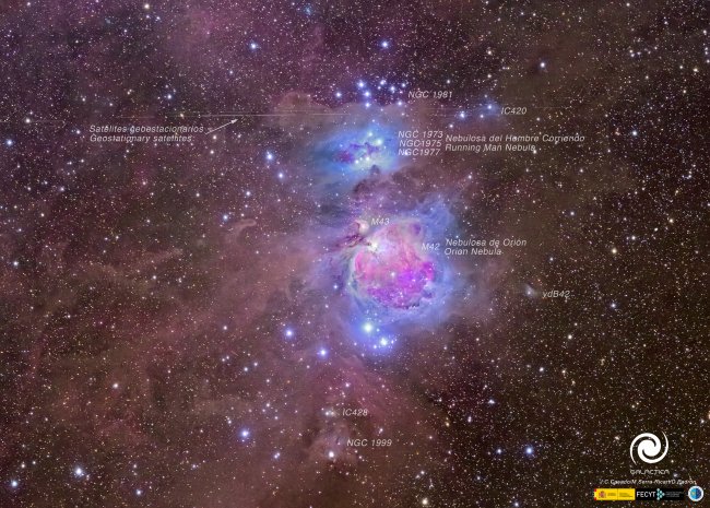 Nebulosa de Orión (M42). También conocida como NGC 1976, es una nebulosa difusa situada al sur del cinturón de Orión. Es una de las nebulosas más brillantes que existen, y puede ser observada a simple vista sobre el cielo nocturno. Está situada a unos 1.270 años-luz y posee un diámetro de unos 24 años luz. Algunos documentos se refieren a ella como la Gran Nebulosa de Orión, y los textos más antiguos la denominan Ensis, palabra latina que significa "espada", nombre que también recibe la estrella Eta Orionis, que desde la Tierra se observa muy próxima a la nebulosa. Crédito: J. C. Casado, Miquel Serra-Ricart y D. Padrón/IAC.