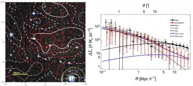 A la izquierda: Imagen del cúmulo PSZ2 G099.86+58.45 obtenida con el CFHT. Superpuesto, en blanco, se muestran los contornos obtenidos en la reconstrucción de masa llevada a cabo en el estudio de “weak-lensing” y, en rojo, la distribución bidimensional de galaxias. A la derecha: relación de la densidad superficial de masa del cúmulo PSZ2 G099.86+58.45 en función de la distancia a su centro. Esta gráfica evidencia cómo la cantidad de materia observada (en negro) supera claramente a la predicha por modelos y simulaciones numéricas (en rojo) a partir de 5-7 Mpc. Crédito: Sereno et al.