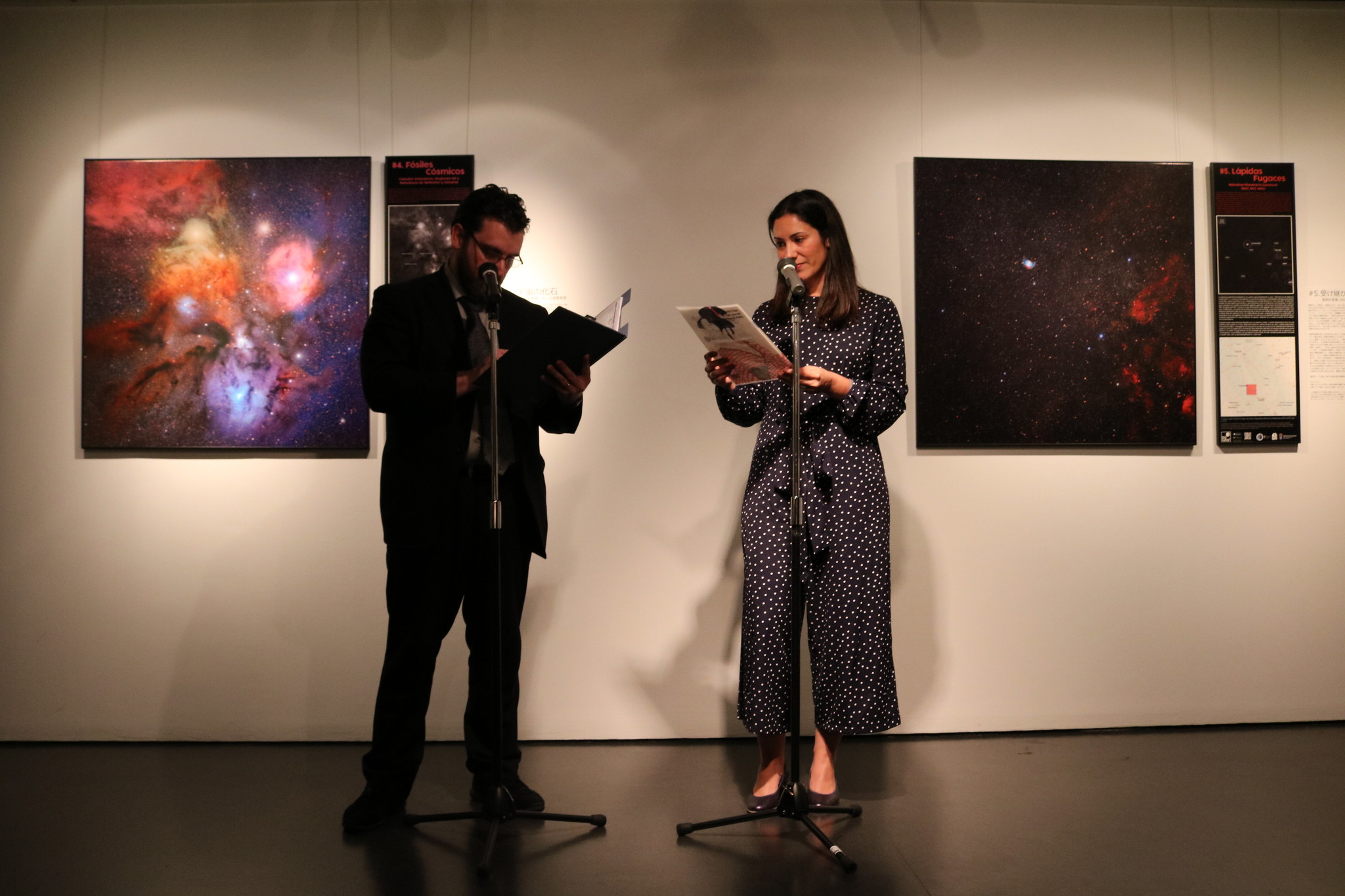 Inauguración de la exposición "100 Lunas cuadradas" en el Instituto Cervantes de Tokio. En la imagen, la astrofísica y divulgadora del IAC Sandra Benítez presenta la muestra delante de dos de las imágenes que la componen: "Fósiles cósmicos" y "Lápidas fugaces". Crédito: Instituto Cervantes.
