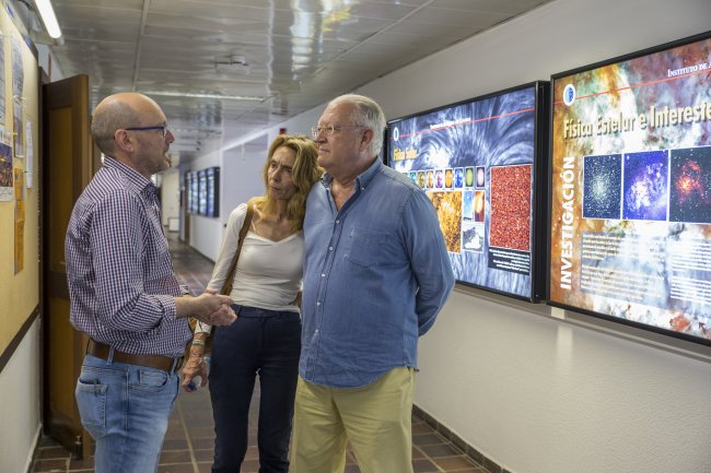 Juan Jesús Armas Marcelo en la sede central del IAC, en La Laguna, junto a su esposa y Enrique Joven, ingeniero y escritor del centro. Crédito: Elena Mora (IAC).