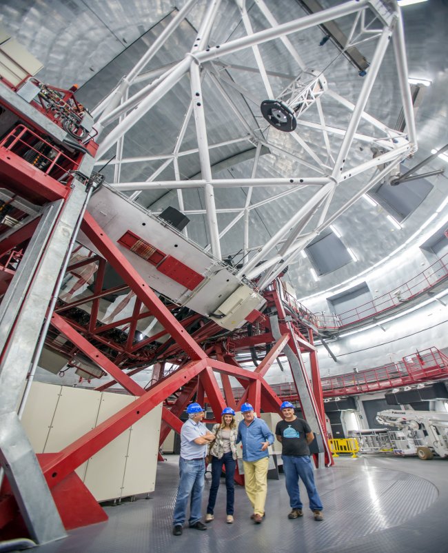Juan Jesús Armas Marcelo y su esposa con el astrónomo y Juan Carlos Pérez Arencibia, administrador del Observatorio del Roque de los Muchachos (Garafía, La Palma) en el interior del Gran Telescopio CANARIAS (GTC). Crédito: Daniel López/IAC.