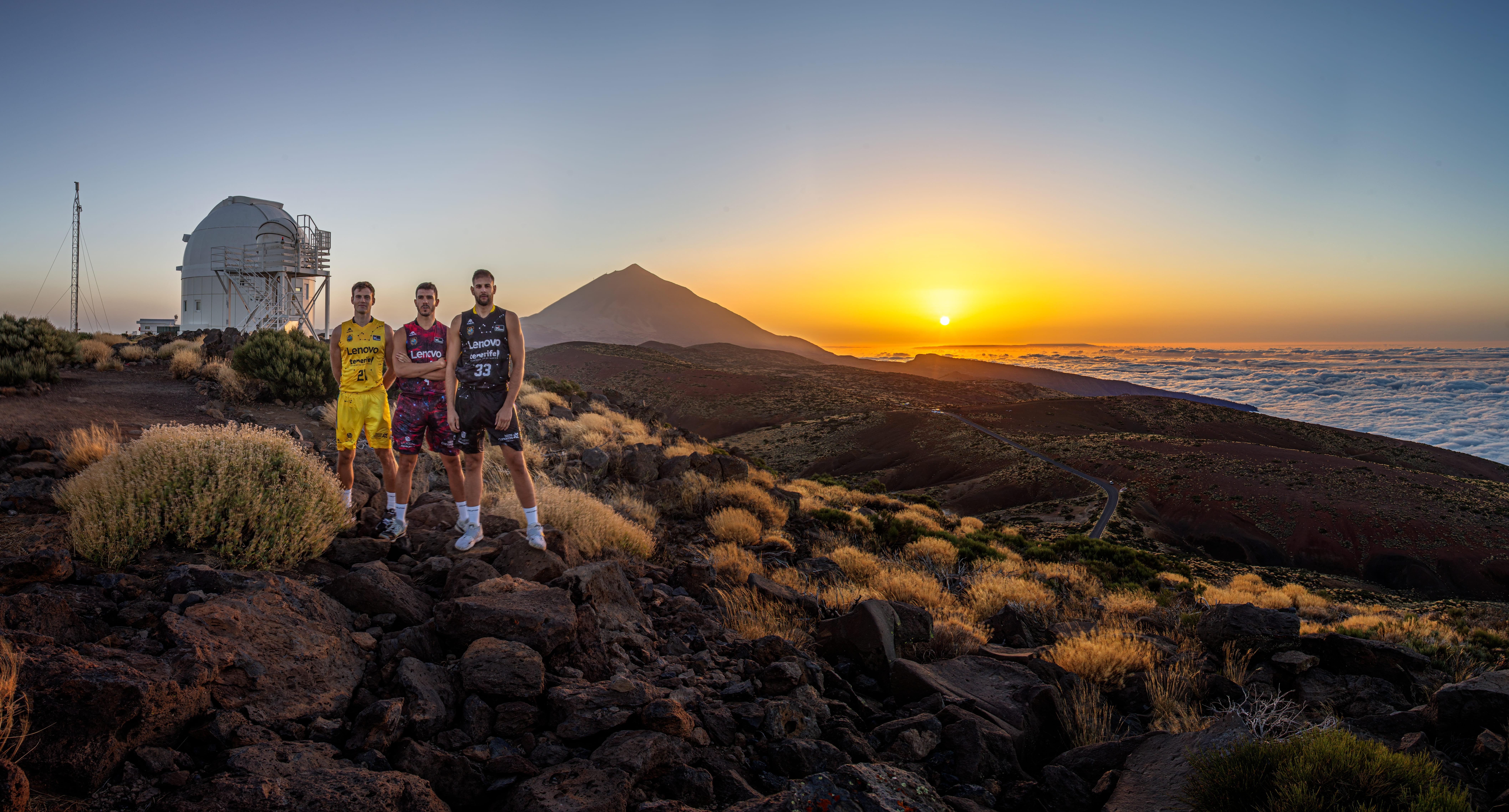 Los jugadores del Lenovo Tenerife Iván Cruz-Uceda , Sergio Rodríguez y Tim Abromaitis con las nuevas equipaciones inspiradas en el cielo de Canarias en el Observatorio del Teide. Créditos: D. López / IAC