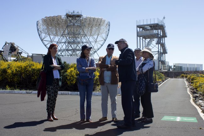 De izq. a dcha.: Carmen del Puerto, Isabel Preysler, Mario Vargas Llosa, Rafael Rebolo, Juan Carlos Pérez Arencibia y Susana Iglesias-Groth junto al primero de los Large Size Telescopes (LST) que forma parte de la red de Telescopios Cherenkov (CTA). Crédito: Iván Jiménez (IAC).